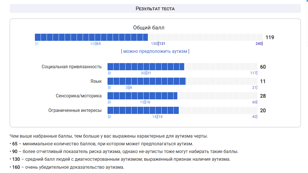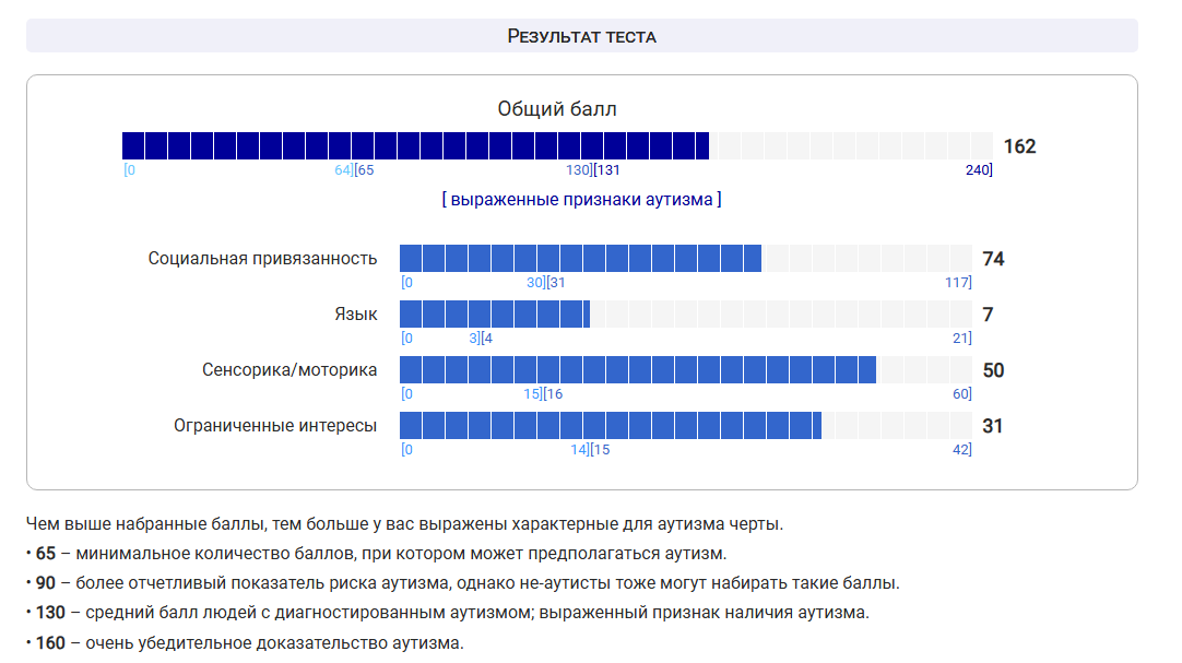 >>7246778 (OP) Общий бал 142 это вообще много? Я никогда не думал что у меня может быть аутизм, типичных признаков типа непонимания метафор, буквального восприятия сказанного, монотонной речи и движений, очень узкого круга интереса и подробного в них погружения у меня нет.