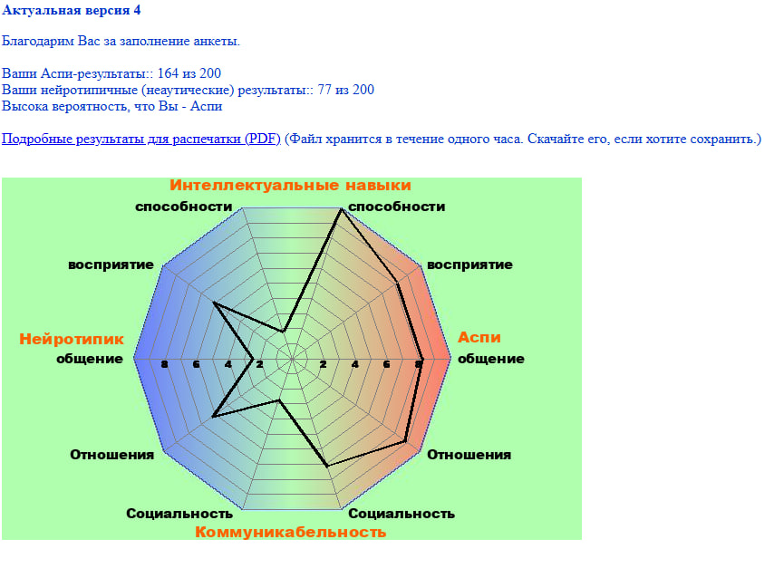 >>7312192 Этот тест создан для прохождения в клинических условиях. Для меня, например, вопросы были слишком абстрактны, или не мог ответить однозначно, или не получалось вспомнить конкретные примеры, но казалось, что было. Поэтому для точности надо проходить со специалистом.