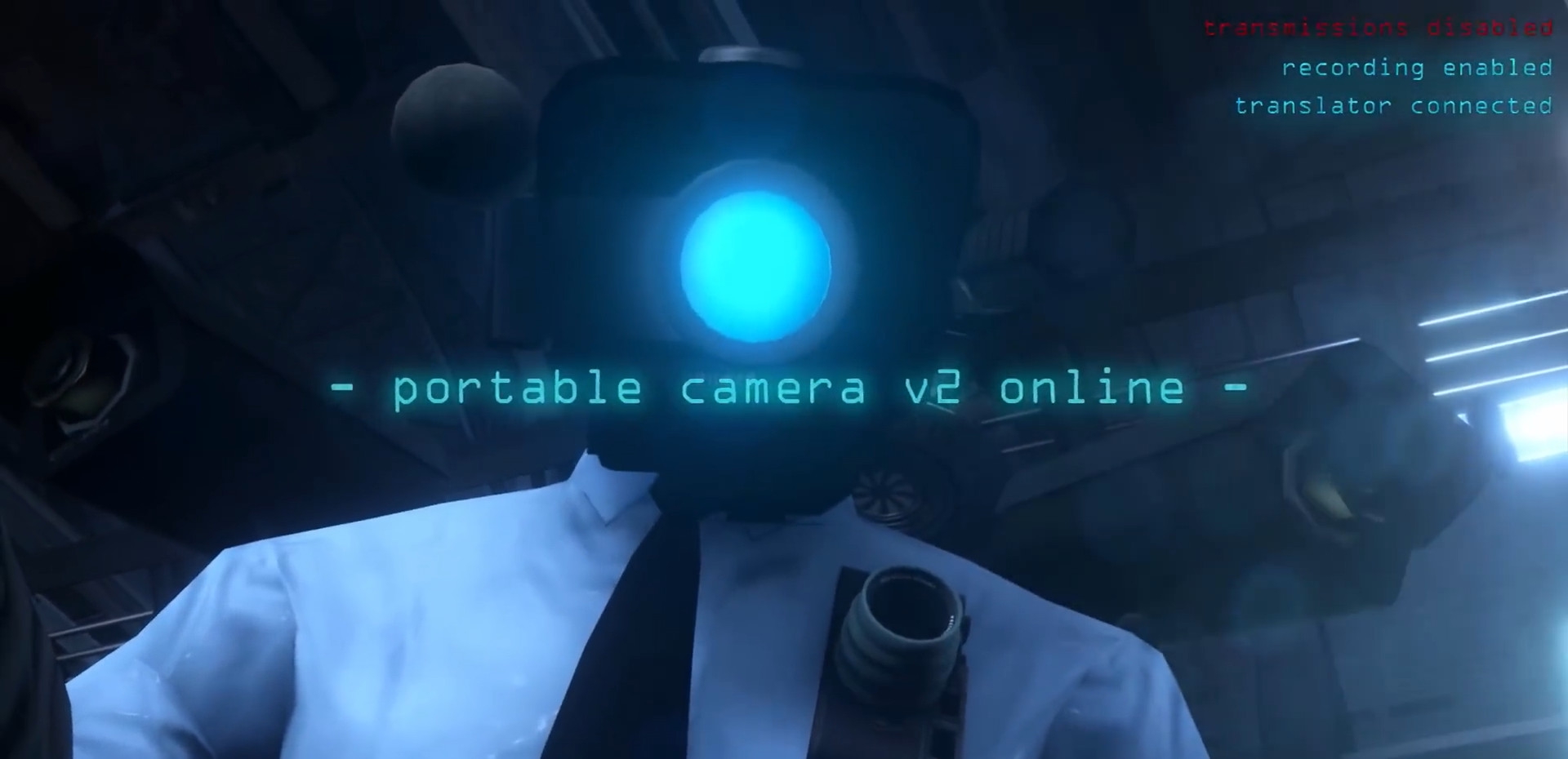 Блэк-Спикермен и Волосатый Скибиди-Учёный показывают Сеньору-Саентисту-Камерамену устройство перевода речи со скибидистского и спикерменского языков. Обе расы общаются схожим образом, передавая информацию через тонкие частоты. С помощью транслятора камерамены смогут понимать речь Спикерменов и Скибидистов.