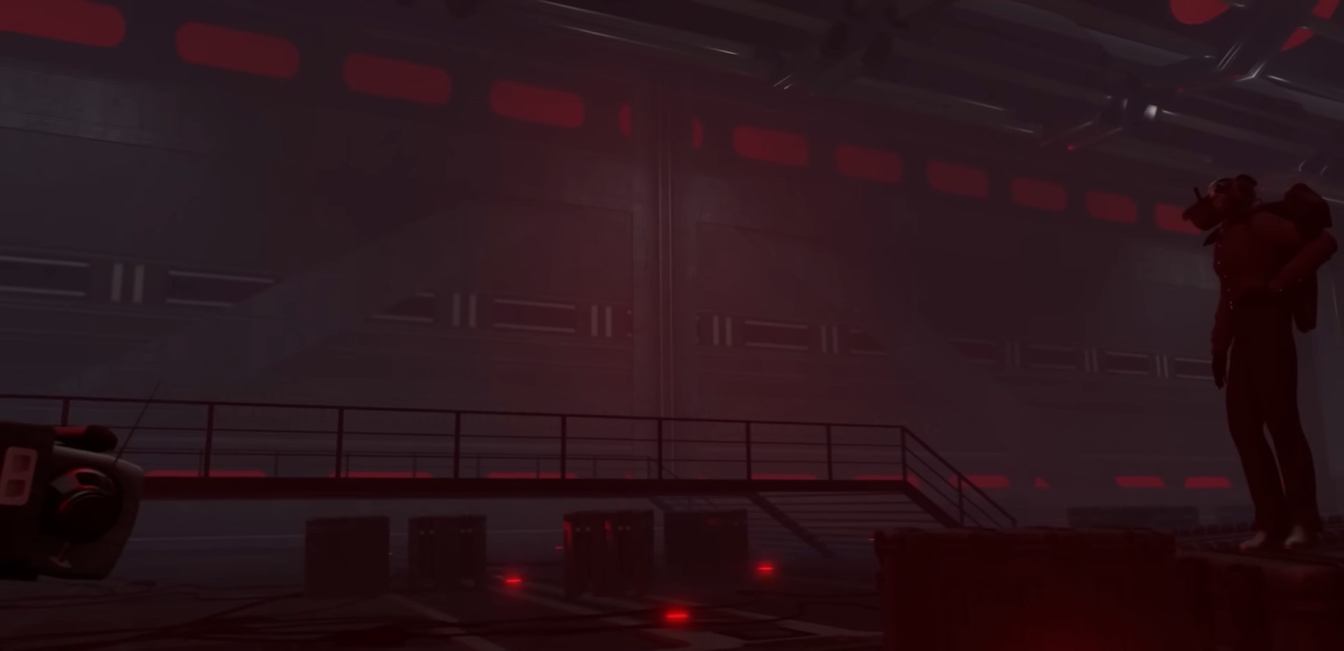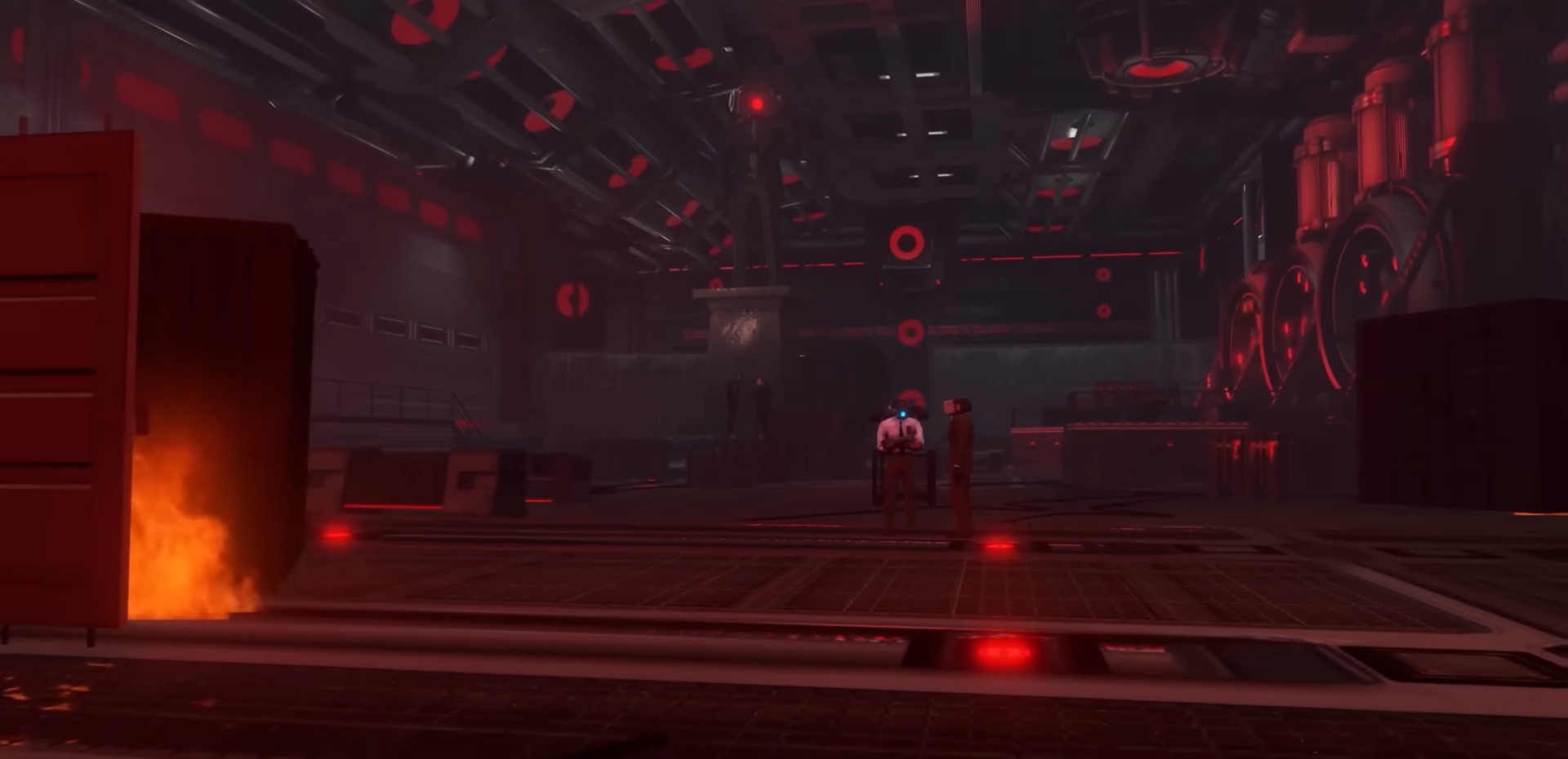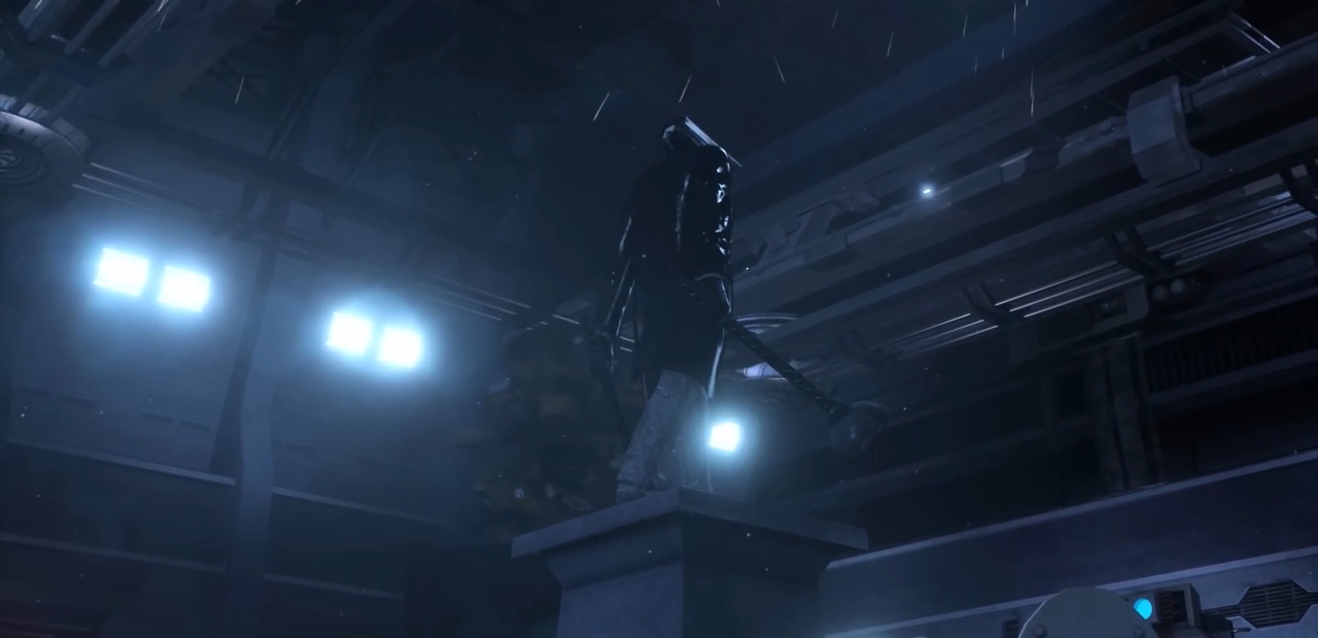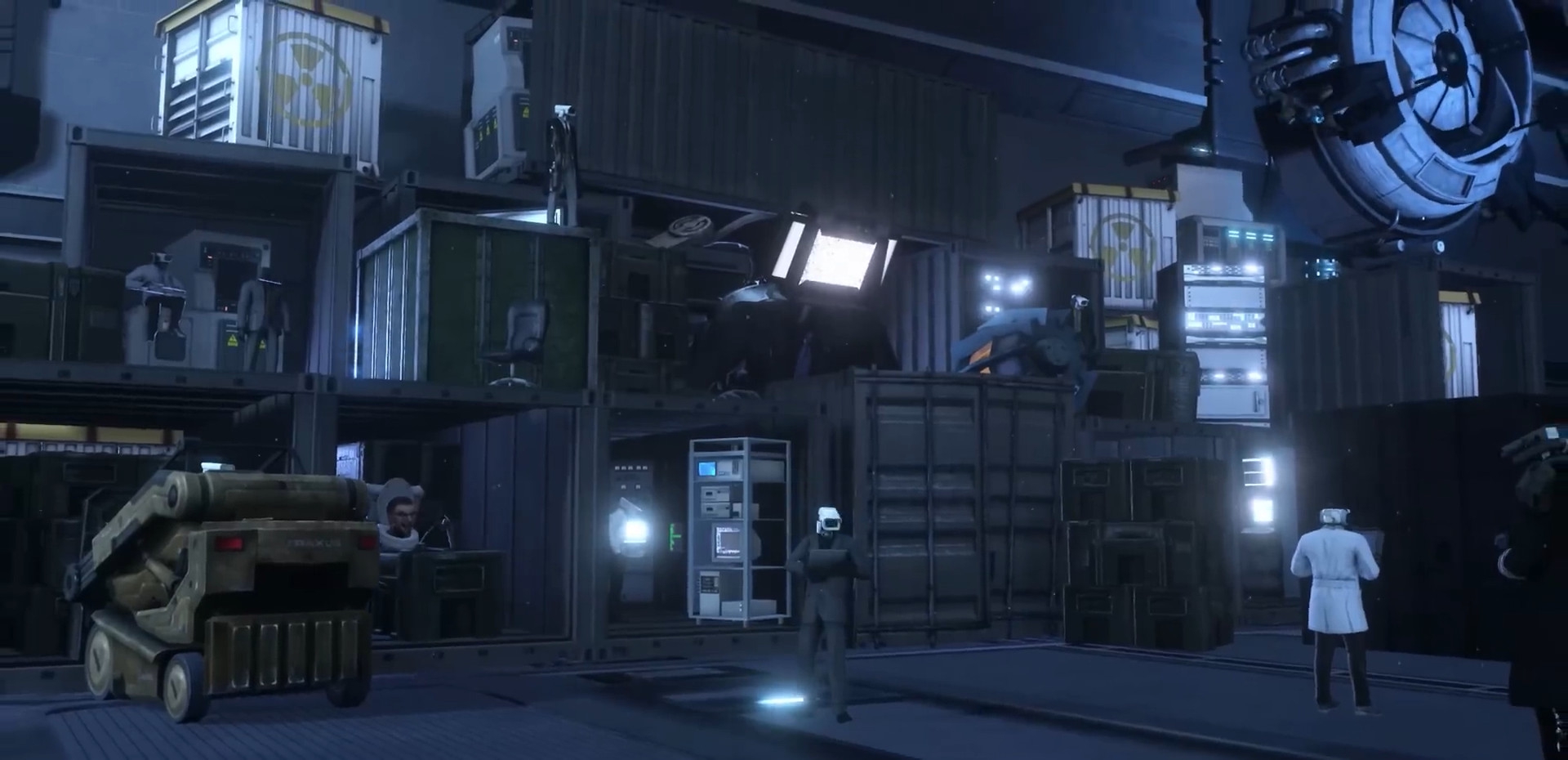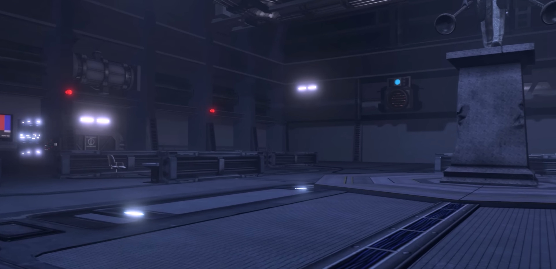 Здесь можно лицезреть базу поподробнее. По аналогии со статуей Вантузхуя стоит статуя Дарк-Спикера. На потолке, стенах — колонки, на правой от POVа стене размещены вентиляторы. Разбросаны контейнеры, небольшой беспорядок, но его уже разбирают.