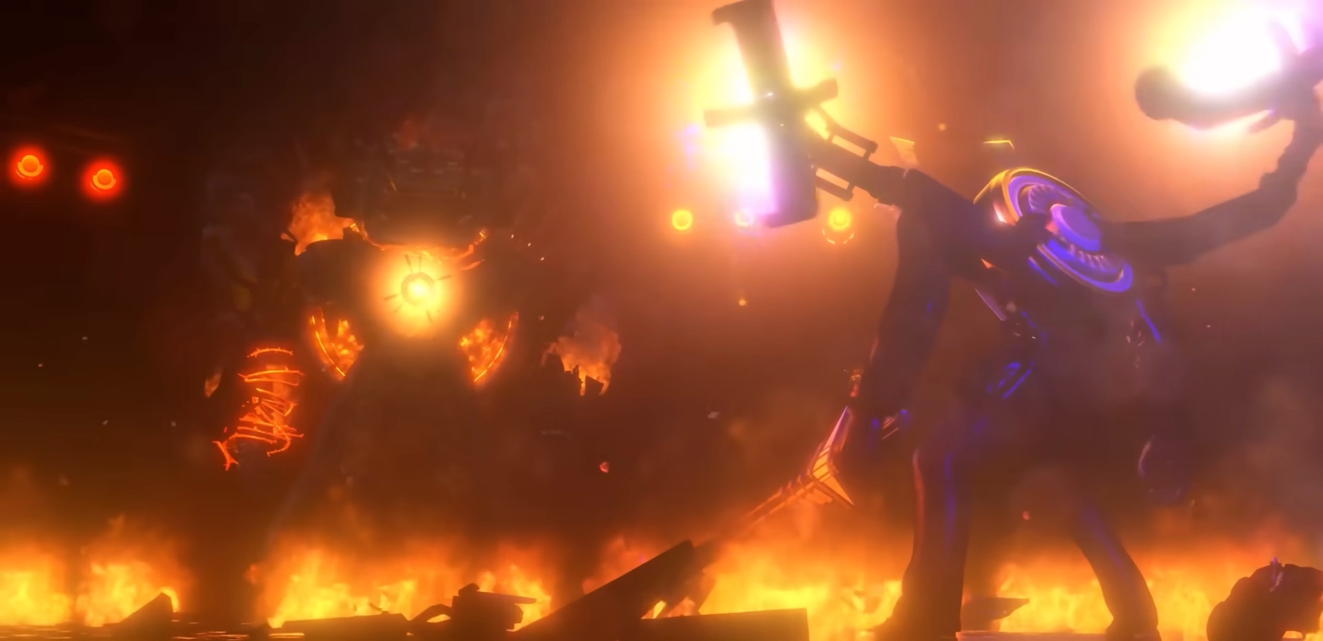 Кислотный цветокор, резкая нереалистичная анимация с минимумом ключевиков, игрушечные модельки (из-за которых иногда меняется впечатление о персонажах, как например новая ми-ми-мишная ТВ-Вуман), смазанный_огонь.gif, низкий угол обзора камеры POVа (проявляется в чрезмерной тряске камеры по всей серии, и особенно ярко в моменте, когда мимо проходит Детектив-Камерамен, загородив своей башкой всё поле обзора).