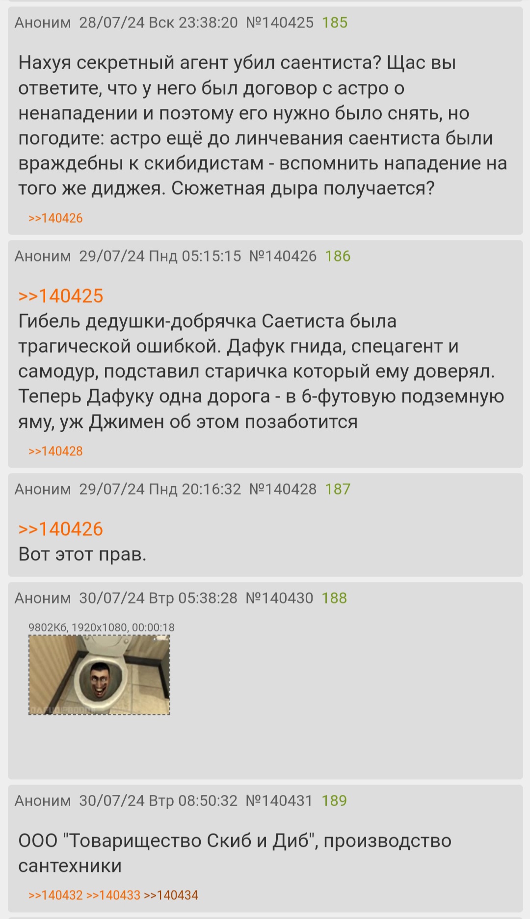 Новая серия мне не понравилась. Серия-червь, серия-пидор, серия-↓↓хуйня↓↓ — речь идёт, конечно же, о "skibidi toilet: emergence | episode 1" — выкидыш, корпоративный гомункул, результат дефекации подвальных индусов из Копрорации Зла, поделка, порождённая калпанией =Invisible Narratives=.