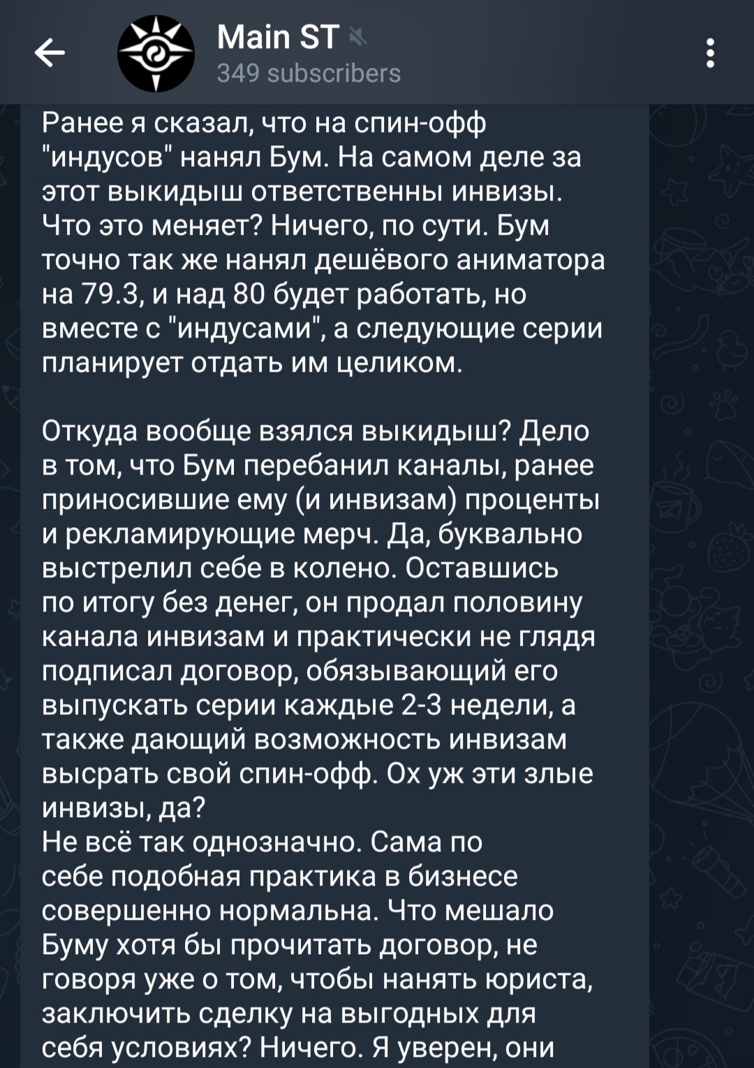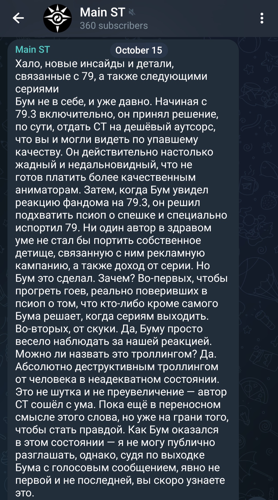 Если верна теория, согласно которой ДафакПук окончательно продал свой канал и анус компании, лишив себя контроля над происходящим, то выходит, что теперь он — куколд, вынужденный наблюдать, как пользуясь его именем на его собственном канале какие-то левые дяди выгружают свои фанмейды, чтобы прорекламить парашу, одновременно с этим оскверняя канон и дискредитируя сам бренд сериала. Возможно, это из-за их давления 79.3 серия получилась сырой, и возможно это было их решение преждевременно выпустить сборник 1-38 серий, который Дапук вообще-то хотел сделать в широком формате.