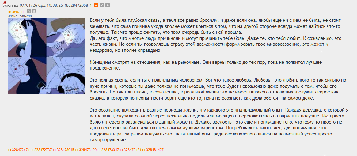 А вообще я ведь уже неоднократно ее с говном смешивал, считая то шлюхой, то ещё кем, а потом вновь возвращался к мнению, что она хорошая (благодаря ее поведению и раскрытию некоторых деталей), но по итогу я (и большинство анонов из этого треда) всё же наверное был больше прав, когда считал ее меркантильной шлюхой... Не верю я уже, что она ко мне нечто хорошее и светлое испытывала. Будь так - не забыла бы меня вот так легко и просто.