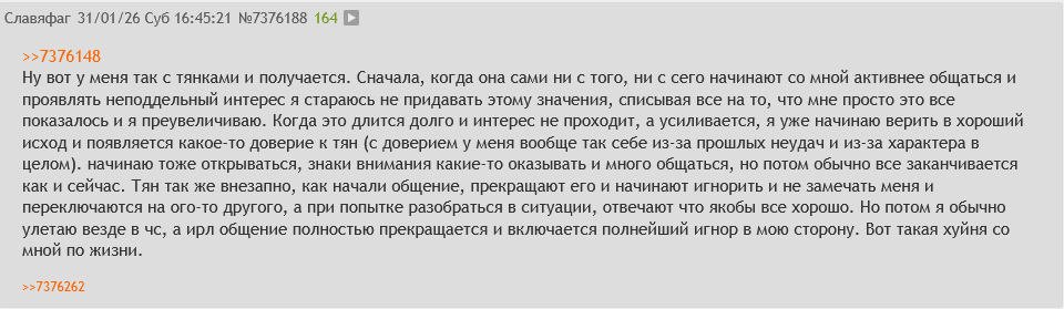 >>7377076 Вчера вроде бы было неплохо, а сегодня вновь накрыло воспоминаниями и мыслями о ней. И я понял, что скучаю по ней. Еще я подумал, что возможно она повела себя так из-за того, что у нее избегающий тип привязанности. Возможно ей действительно было хорошо рядом со мной и она хотела быть рядом, но я сделал что-то не так или зашёл дальше, чем ей хотелось и у нее включился защитный механизм в виде игнора. Не знаю конечно, но эта версия звучит вроде бы убедительно.