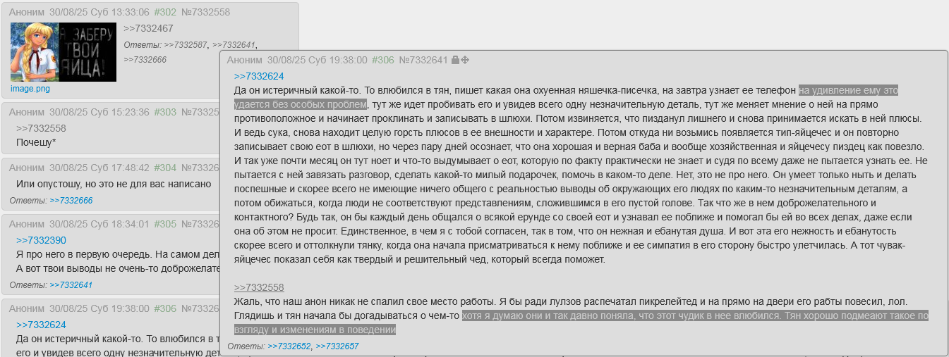 >>7373310 Ну лучше я тут выскажусь в очередной раз. А представь, если бы я все это вылил ей в тг? Тут фразой "все, хватит" точно бы не обошлось. Хотя скорее всего она бы просто проигнорила и в чс закинула, а сама потом ещё месяц-другой некоторым коллегам этот пиздец в виде переписки демонстрировала, приговаривая "Нет, ну не долбаеб ли?"