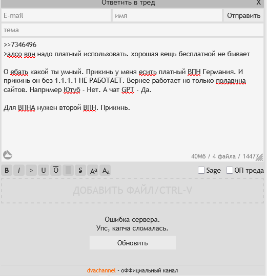 Для ВПНА нужен второй ВПН. Прикинь. Просто смотри какая дичь сейчас происходит. Даже пост отправить не могу.