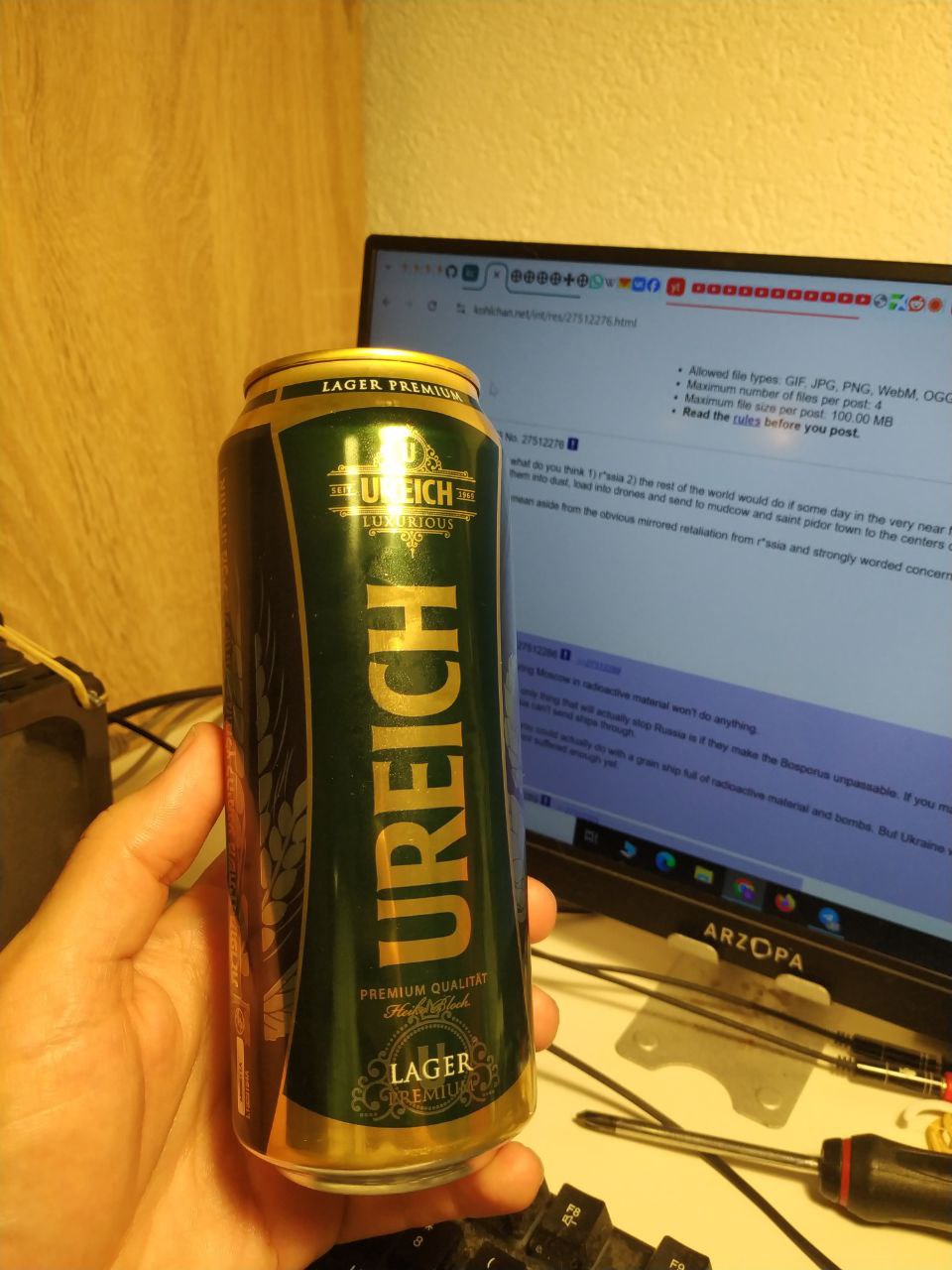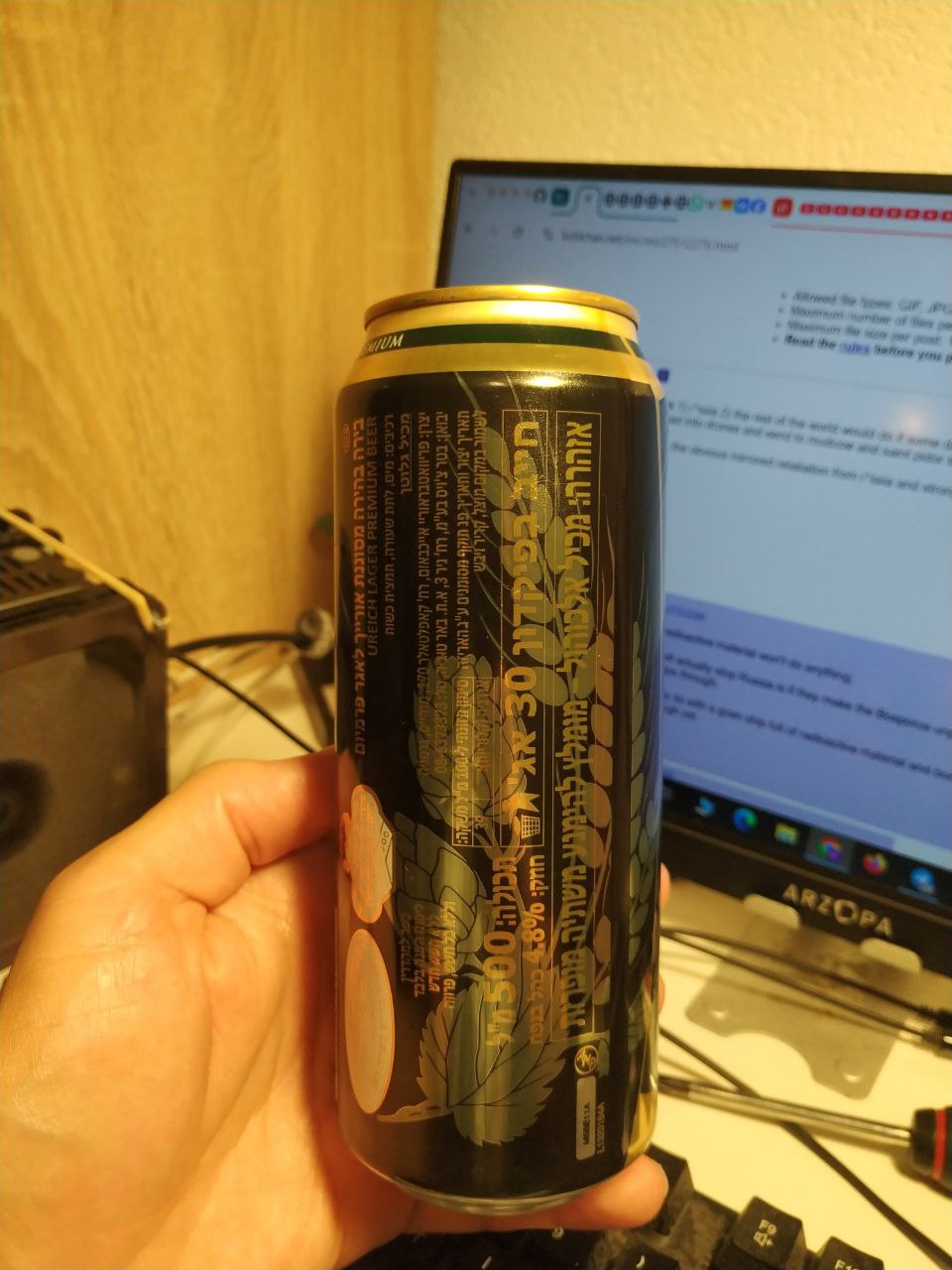 я расстроился кстати, купил тут на днях в швейцарии пакет арахиса жареного - а он невкусный. слабо солёный и короче как-то невкусный в целом. а ещё я охуел сегодня. на днях в одном магазине купил какое-то дешёвое пиво. сейчас пью его - смотрю, блять, что за хуйня, на нём написано на иврите (или чём-то таком) и на русском нахуй. я сначала подумал что у меня галюны и я допился уже. причём произведено оно в германии. что за пиздец?