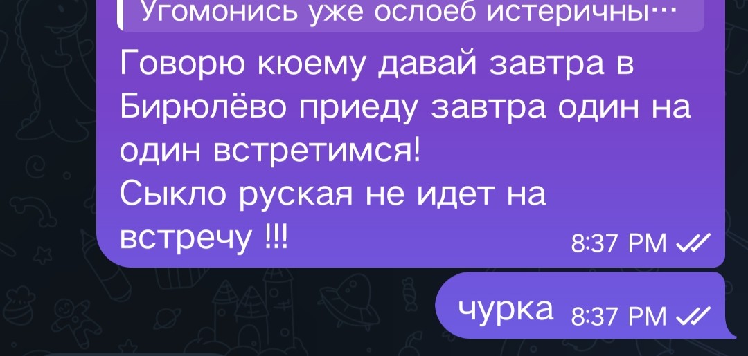 >>7357166 блядовала неделю с хахалями щас приперлась ныла что мне на нее якобы плевать.мол ни разу не позвонила не написала хотя она мне сама писала каждый день поэтому я не переживала. и доеблась до мелочей что я не доела ее макароны что плохо посуду помыла одна буду жить сгнию в груде мусора без мамки никуда)) когда я начала на нее орать уже потому что выбесила скзаала "ну ета жи правда направду не обижаюца копец ты злая психованая все ухажууу"