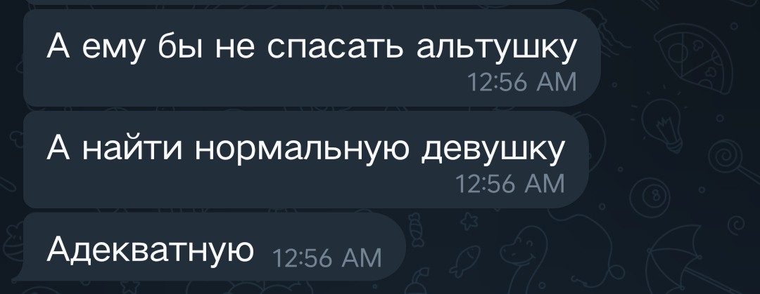 вчера очень расстроился. пару дней назад Лена в своём телеграм канале выложила фотку нескольких бутылок крафтового пива которое она тас нашла и купила в своей испании. ну а я вчера купил тоже крафтового пива и под тем её постом в комментариях выложил свою фотку и написал что вот такое вот крафтовое пиво я тут купил в рф. после чего Лена мне в личку написала "Ты чо в моем канале постишь свои покупки? Заведи свой" и записала голосовуху где скаэала "Мне вот просто интересно, ты сам как думаешь, моим знакомым, которые тебя знать не знают, интересно смотреть что ты себе покупаешь на ужин и какие ты любишь свины ушки?". после этого я ей написал ответ что извиняюсь, не подумал, впредь буду такое в личку аисать, после чего она мне написала голосовое "Саша, да мне не надо это в личку, ты думаешь мне в личку нужны фотки всех твоих покупок? Прости, но нет, не нужны". ну в общем в очередной раз мне жизнь прямым текстом сказала, напомнила, насколько я не интересный и скучный человек и по этому крутым и интересным людям типа Лены, которые там разбираются в крафтовом пиве, например, и между собой его там обсуждают и всякие его нюансы, никогда не будет интересно со мной общаться и я никогда не буду равным им в их глазах. и главное что с этим ничего не сделаешь. можно накачать мышцы, можно заработать денег, но это никак не исправить. если родился скучным и не интересным то с этим уже ничего не поделать. мне настолько грустно от этого стало что даже задумался о суициде с помощью охотничьего ружья, но вместо этого лёг спать, тем более что я не знаю куда папа убрал моё охотничье ружьё, где оно лежит, а спрашивать мне неудобно потому что родители сразу забеспокоятся что я спрашиваю где ружьё потому что хочу совершить суицид
