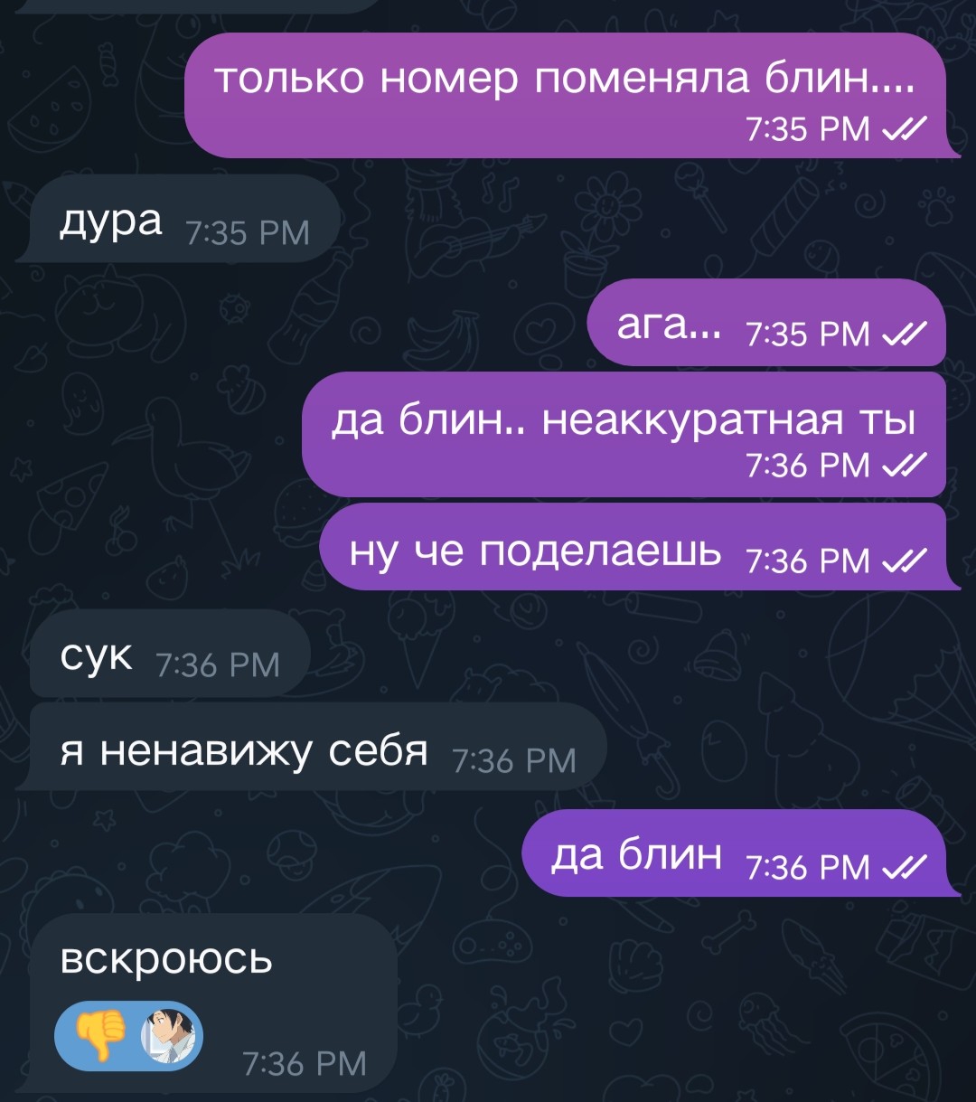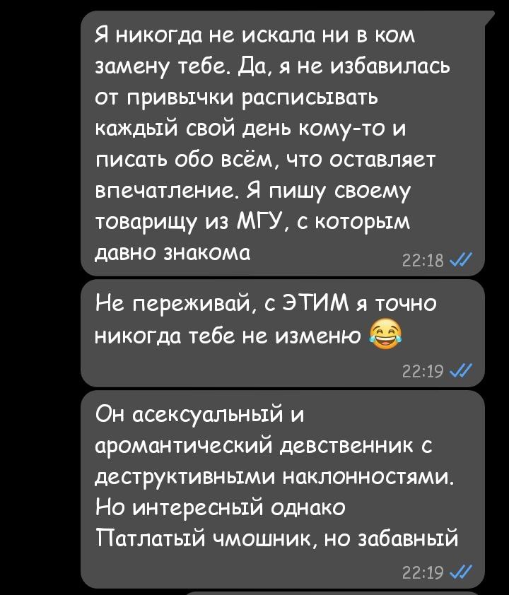 прочитал в телеграм канале Лены как она хорошо жила в 2016ом году. стало обидно и грустно потому что у меня была хуйня какая нибудь, я даже не помню. очень грустно стало что такая хуёвая жизнь. вот по этому я перестал общаться с той тян с которой отдыхал летом 24го. с этой Леной надо тоже как-то перестать общаться, но как, чтоб без кринжа. в инстаграме она меня уже опять заблокировала за то что я ей посылал рилсы, как бы так же сделать и в телеге