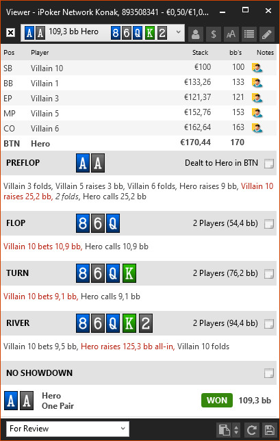 >>3255388 Да не, я про сайзинг больше. Если бы он 67%+ поставил, то норм. А в 50% я просто интуитивно вижу очень мало блефов. Но очевидно, я тут ошибся, просто стараюсь не отталкиваться от результатов.