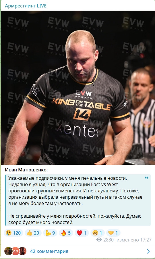 >>3222649 Чё-то там сложности какие-то, но я бы не сказал что развалилась. Может заявления поспешные от спортсменов и смогут договориться. https://t.me/armwrestling_live/397