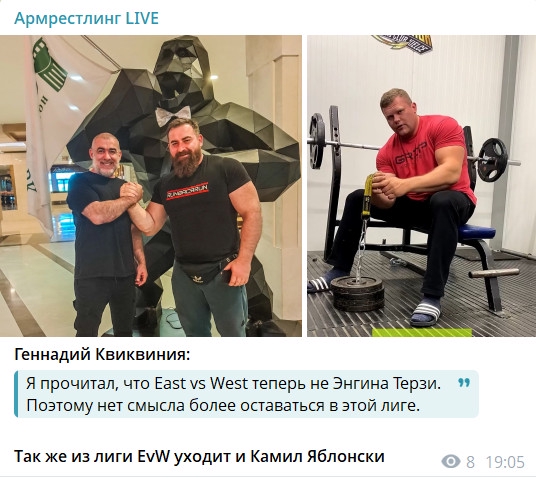 https://t.me/armwrestling_live/408 Ууух бля чё началось. Движуха. Слабачок Девон всё делал так, чтобы поединок с Виталей состоялся на удобной для слабачка Девона территории, пока его жена будет развлекаться с Артемом Тараненко. Только не понял, когда Девон вошел в совет директоров EvW? Или он там с самого начала был?