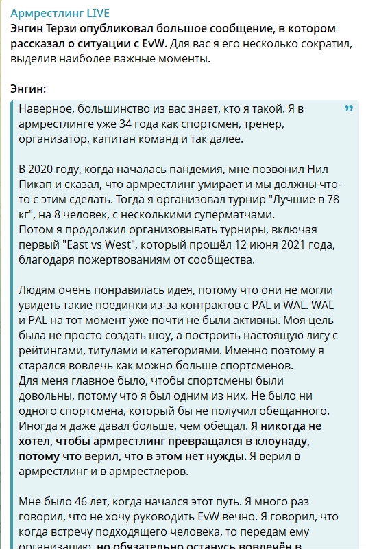 Мое видение следующее: Энгин продал дауну Бекстеру бизнес задорого, тот начал творить откровенную лоуайкью дичь, увольнять людей, задерживать выплаты, лоббировать америкосов при общем падении качества трансляций. Энгин тем временем тайно готовил новую лигу. Также были новости о чем-то крупном в Дубае. Лалетин заявил, что будет бороться в сентябре, при этом Ларратт сказал, что на август уже запланирован турнир в Америке на ивенте Брайана Шоу, а значит Лалетина там не будет. То есть вероятно Виталя уже готов к сливу в новую лигу. Таким образом Энгин прогрел на бабки дауна Бакстера, и, заручившись лояльностью большинства европейских спортсменов, готовит новый бизнес.