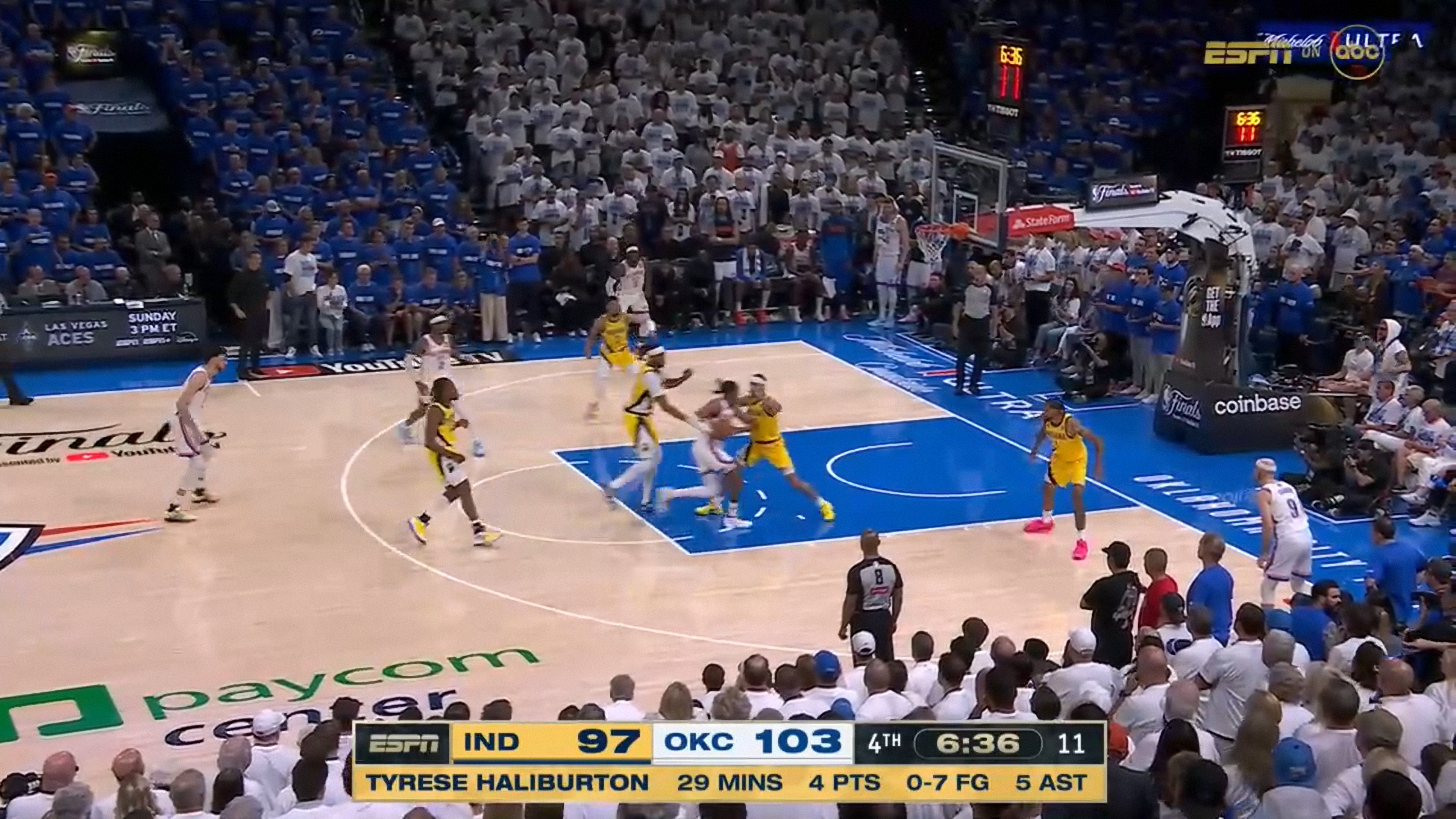 У Индианы отобрали главное оружие - отсутствие потерь. Количество потерь какое-то аномальное, не удивлюсь если это (анти)рекорд в финалах НБА. И такими вводными, с такой очень слабой игрой Халибёртона, когда казалось очевидным что Окла заберет первый матч на своём паркете, Тёрнер, Сиакам и Немхард включаются в нужный момент.