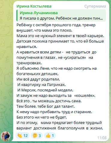 >Марина Сарычева больше не тренируется в штабе Этери Тутберидзе: >«Мама два дня плакала и никак не хотела понять и принять, что я ленивая спортсменка, которая не готова трудиться у Этери Георгиевны Тутберидзе. А потом плакать перестала, купила Этери Георгиевне цветов и меня простила. >Уже два дня я тренируюсь в другой спортшколе... >Мама, прости и отпусти...»
