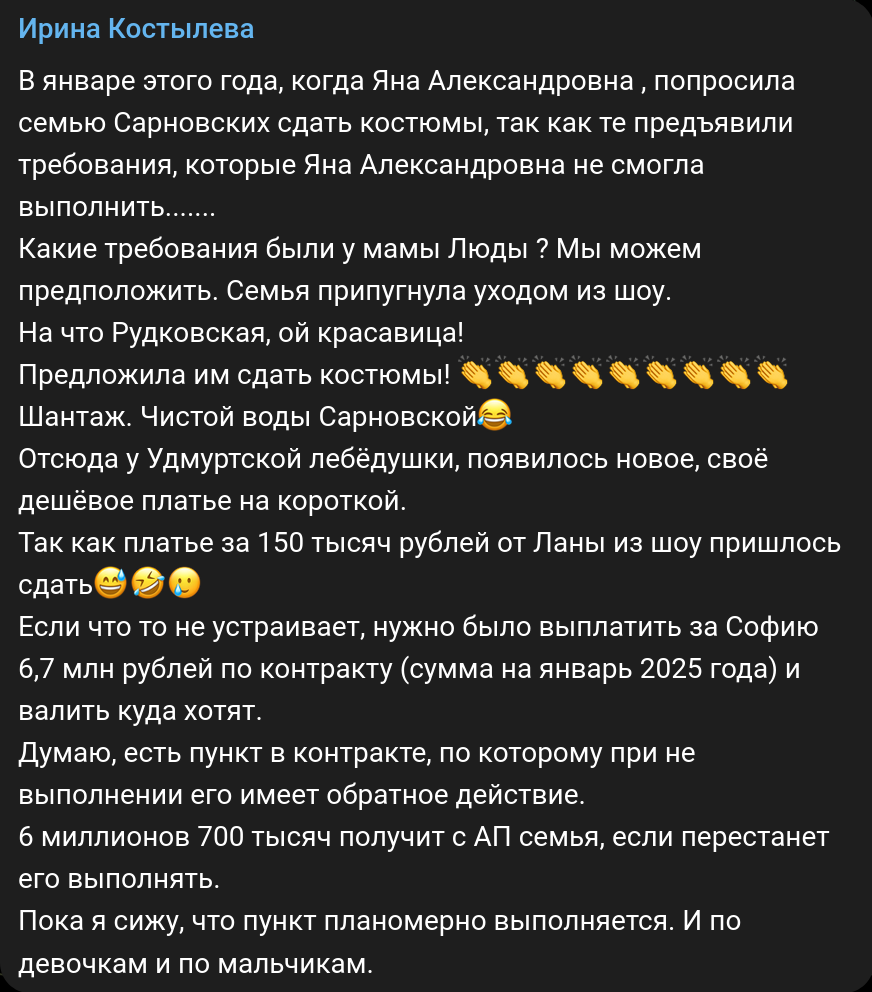 >Вечер пятницы обещал быть спокойным и основное внимание болельщиков фигурного катания было приковано к игре в падел теннис Щербаковой со старшим сыном Рудковской. И просто как гром среди ясного неба в сети появились видеоролики и аудиозаписи от Ирины Алексеевны, где она обвинила свою дочь (созданную с помощью новейших генетических технологий) в очень серьёзных вещах ("к 16 годам она нас с папой прирежет и в мешок сложит", "у неё гены такие плохие").