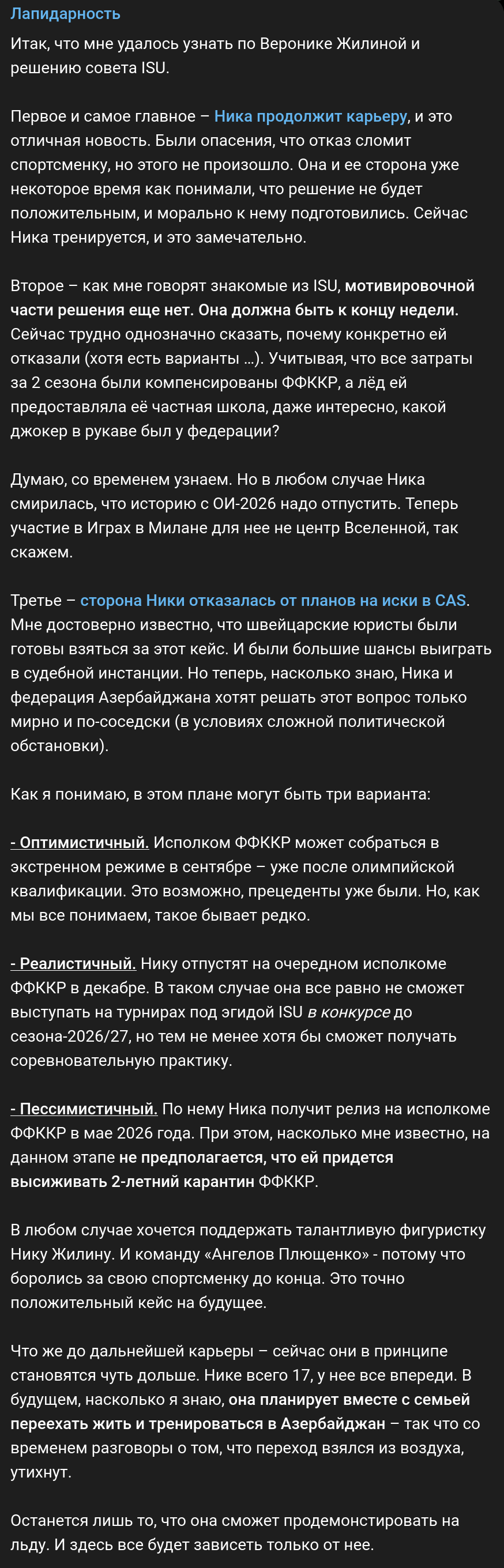 >Перестать слушать «группу желающих», — ответил Сихарулидзе на вопрос РИА Новости, что делать Жилиной, заявившей о готовности выступать за Азербайджан и переехать в Баку. — Убежден, что ей нужно выступать в России. В любой момент готовы ответить на звонок Вероники, поговорить с ней в офисе ФФККР. Пора уже поставить точку в этой истории. Жилина — талантливая спортсменка и может на долгие годы стать одним из лидеров сборной России.