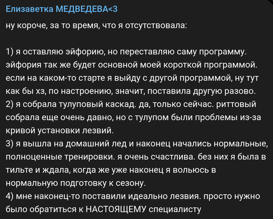 >ну как бы, фигуристок много, а личность лиза медведева - одна. я изначально свой контент в тт не толкала , как фигурнокатательный. это просто часть моей жизни, очень большая часть.. >а так , я не «фигуристка», я бля лиза медведева, ребят😎😎😎