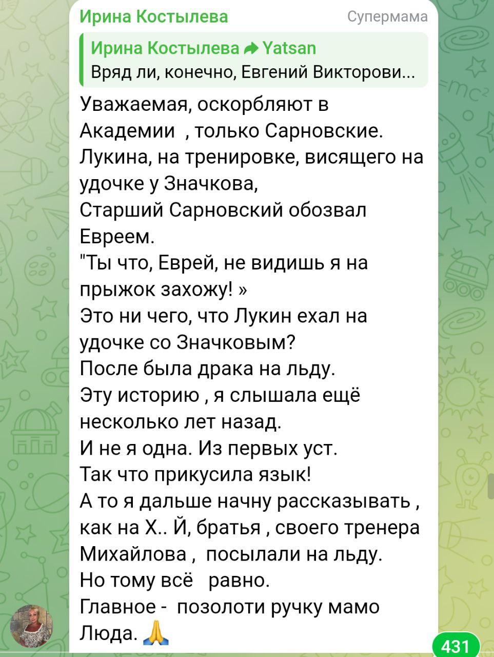 >>3231665 Хотела эту историю про "она же ребëнок" Рассказать, если это понадобится в экстренном случае. Но видно, чтоб составить истинное☝ представление о Софии Сарновской рассказываю : В конце сезона, Лена в 8,30 на разминке в зале ОФП в Горках, при Трушкове и Значкове, делая упражнения колесо -дупель, выворачивает руку в локте, в обратную сторону. Кричит от боли бегает, трясëт ей и возвращает еë на место. Это видят все спортсмены нашей группы -13 человек. Лена выходит на лëд с перевязаной рукой. Я прихожу, когда прошло уже пол льда. Смотрю в окно из кафе на тренировку. Ждëм доктора, едем в травмпункт Одинцово. То, что Лена повредила руку на разминке , знала вся наша группа и тренерский состав. Теперь внимание. 👿