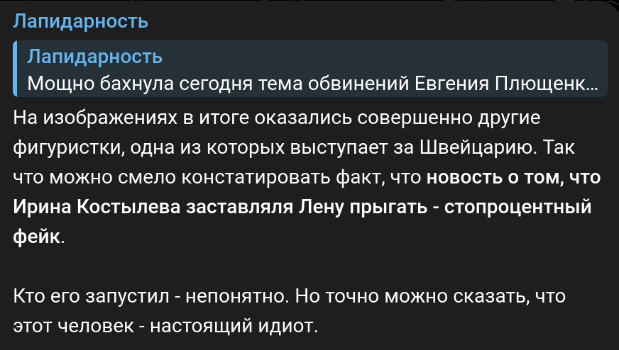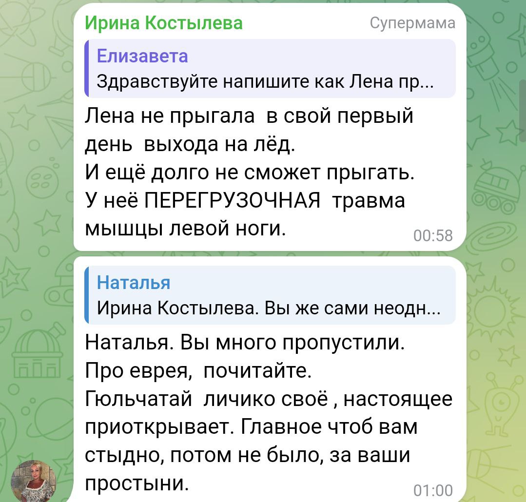 >⚡️Ирина Костылева сообщила, что могильщик-козёл ввёл Лену в рецидив перегрузочной травмы перед контрольными прокатами: