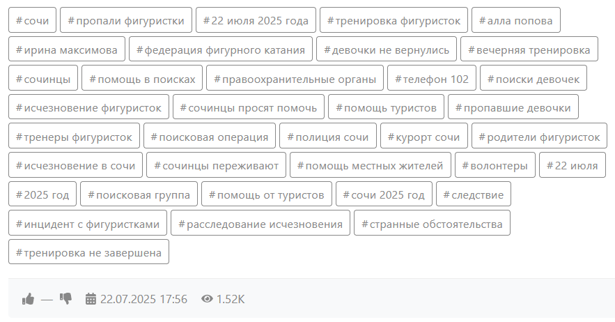 https://t.me/sochi_sochi/7935 >Jul 22 at 17:06 >В Сочи пропали две юные фигуристки. >Федерация фигурного катания города Сочи сообщает о пропаже двух воспитанниц нашей школы. Алла Попова и Ирина Максимова не вернулись домой после вечерней тренировки. >В данный момент уточняются обстоятельства их исчезновения. >Мы обращаемся ко всем, кто обладает какой-либо информацией или видел наших девочек, незамедлительно сообщить в правоохранительные органы по телефону 102 или на горячую линию по номеру 8-800-700-54-52. >Просим всех не оставаться равнодушными и помочь в поисках. Помогите вернуть наших воспитанниц домой!