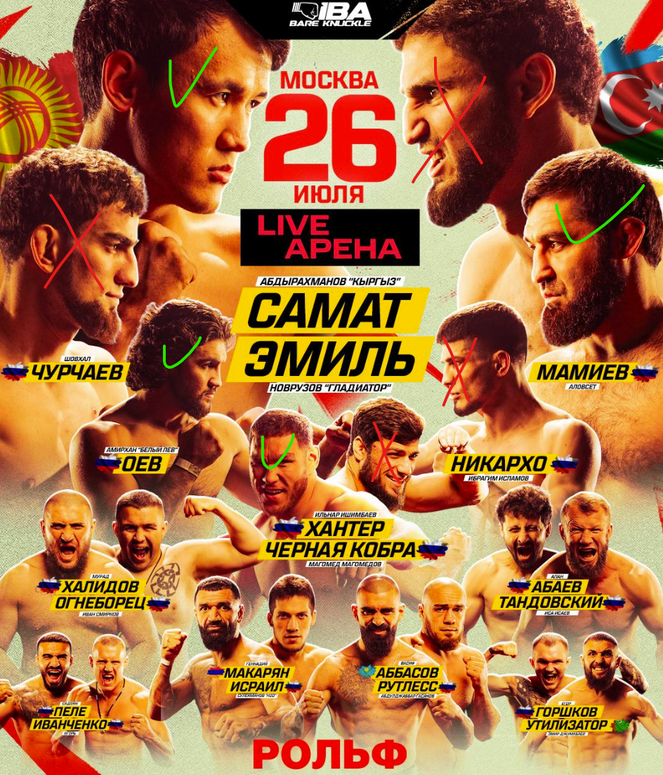 Братва, я решил переобуться. В смысле уточнить свои ставки ввиду новейших реалий. Берсерк - Мизаушев. Победа Шелеста по очкам. Главное, не заснуть во время просмотра турнира на этом бою. Учитель - Узбекски Левша. Победа Учителя нокаутом. Орёл - Балу. Победа Балу нокаутом. Орёл как был лохом, так и останется. А Балу развивается. Хан - Спивак. Победа Хана из-за невозможности продолжения боя Спиваком. Спивак будет садиться на жопу и отдыхать. Имеля - Фомич. Победа Имели нокаутом. Фомич будет чудить после боя. Ренбист - Шиколай. Победа Регбиста по очкам.