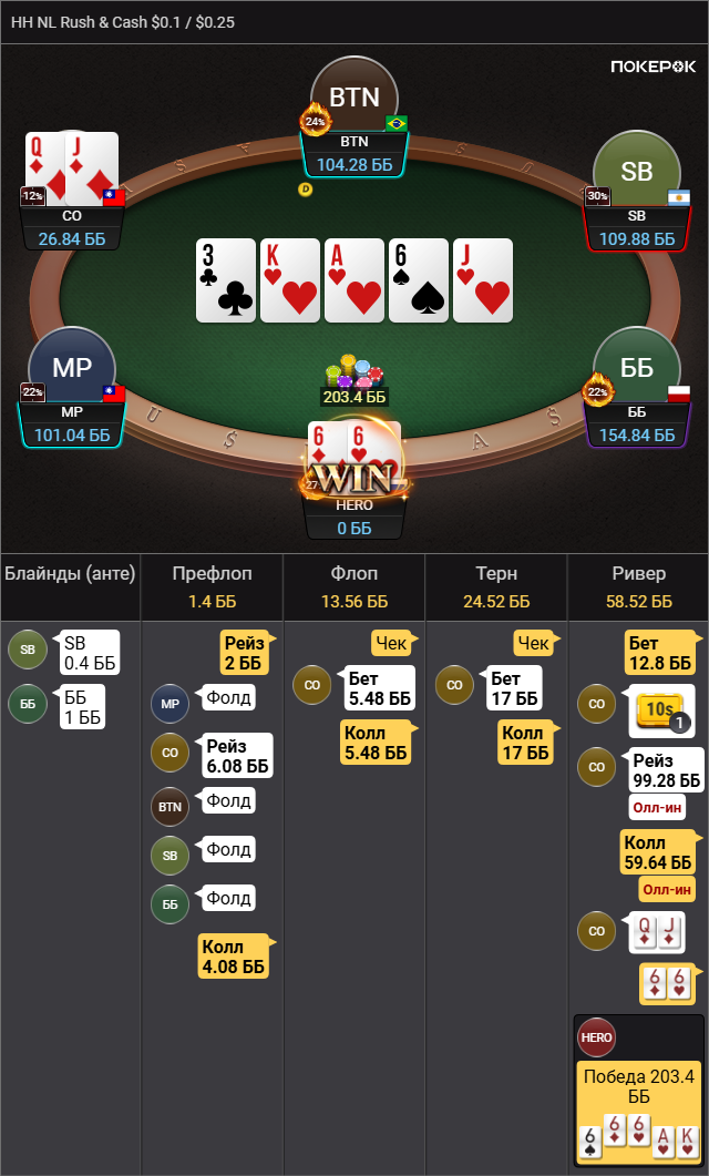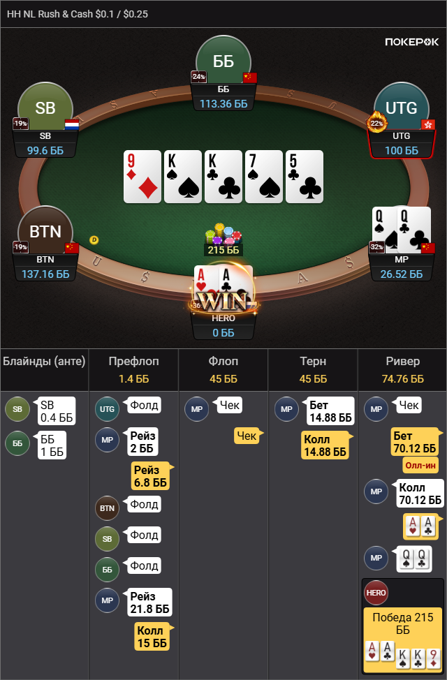 Выбивает все мои TT-KK, которые дают бедбит джекпот, проплачивает миллиард карет, ведь в мультипоте в колесо флопом я вполне могу ренжчекать и все тузы у меня будут. Браво маэстро.