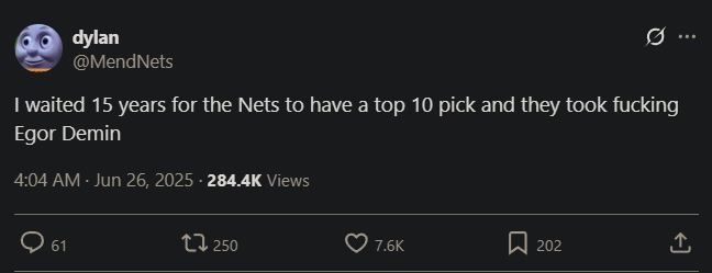 На Реддите куча хейта, не верят в пацана. Типа высоко пикнули. Путин лично попросил Цая. Всё, последняя крышка в гвоздь гроба Нетс - предлагают болеть за русского. И тд. Если отбросить политоту, то Халибёртон ушёл 12-м, Макси 21-м, у вас есть топ 5 надёжных челов, остальные +/- лотерея.