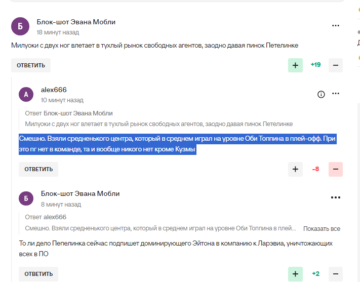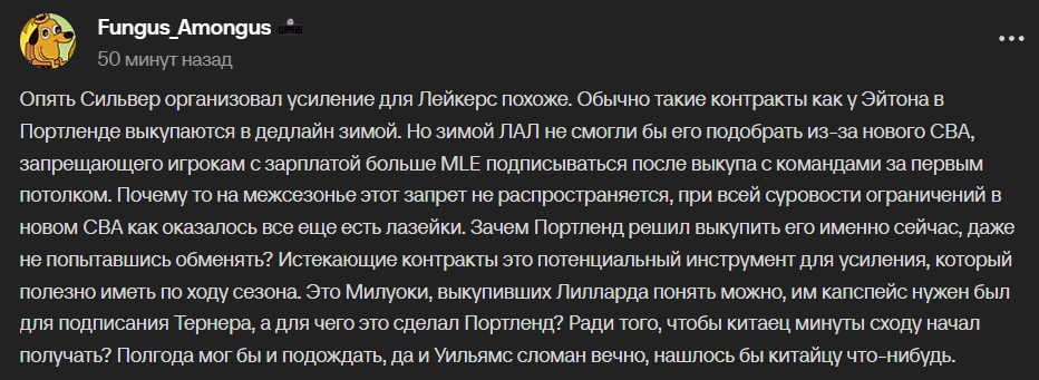 Аххаахаха, неужели фанаты ЛАЛок реально верят, что их клуб с тренером-подкастером, плешивым дедом, пончичем, и челом, которого выперли из ПОРТЛЕНДА БЛЯТЬ благодаря этому трейду стал контейнером? Они совсем уже делулу? Нынешний Эйтон ничем практически не лучше сраного Хейса, разве что погабаритнее, только вот ленивый и с характером траблы. Пелинка что, рассчитывает, что Леброн ещё и над Эйтоном шефство возьмёт, как над Лукой? Пиздец, я хуею с этого цирка, а ещё больше хуею с фанатья, которое на что-то рассчитывает в этом сезоне. Пока что вообще ощущение, что зря ЛАЛк АД и Кристи на Луку выменяли, каким бы хрустальным АД не был, см ним состав был сбалансирован, и на контендерство как раз больше шансов было бы, чем сейчас, ну а Кристи так вообще отлично прогрессировал в прошлые сезоны. Ещё и ДФСа просрали теперь, ну пиздец. В итоге защиты вообще нет на грядущий сезон, тут только Леброна если впарить Никсам или хз кому, Кливленду вряд ли получится. Только вот зачем тогда Эйтон вообще нужен будет, лавочником за 8 лямов в год?