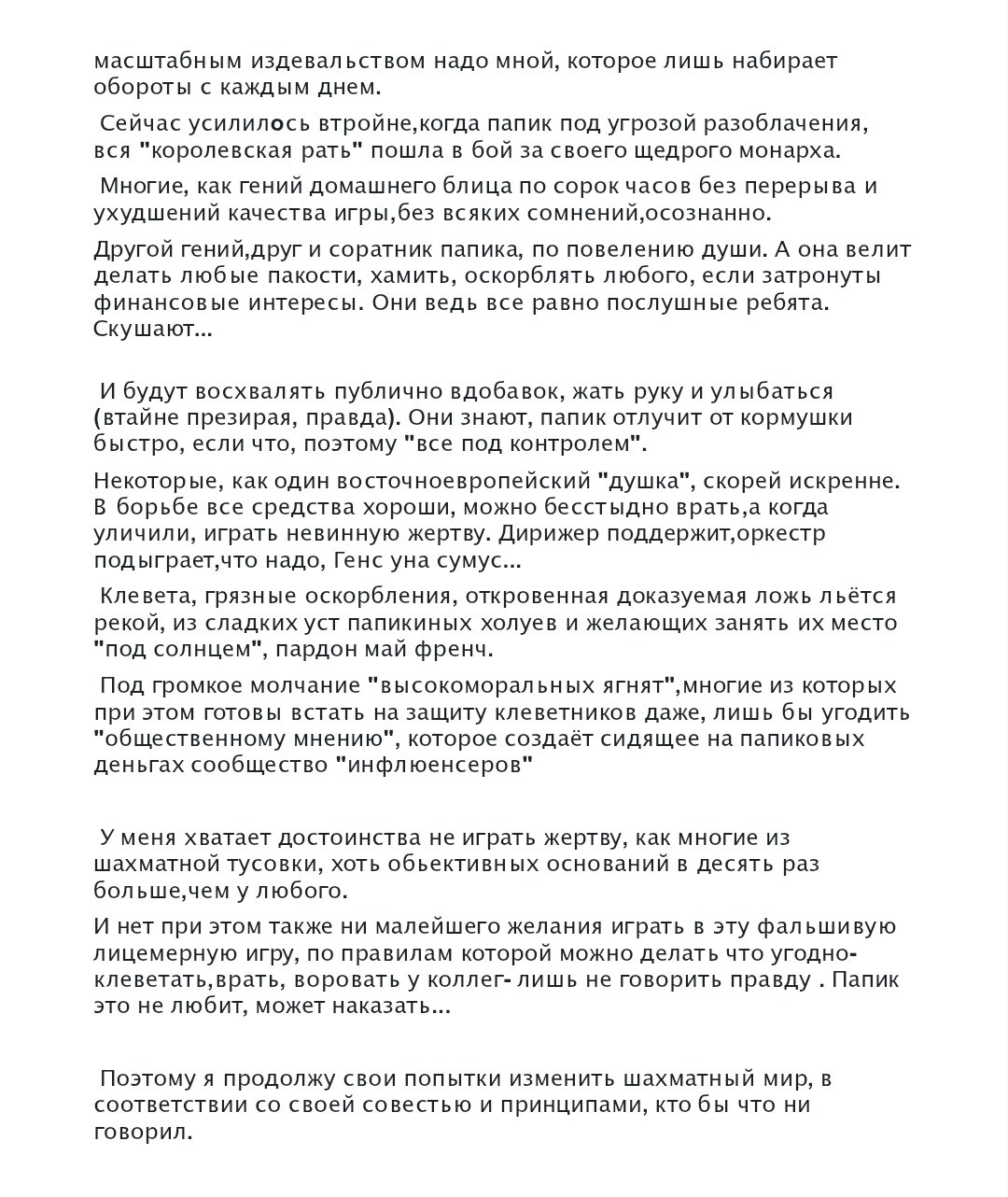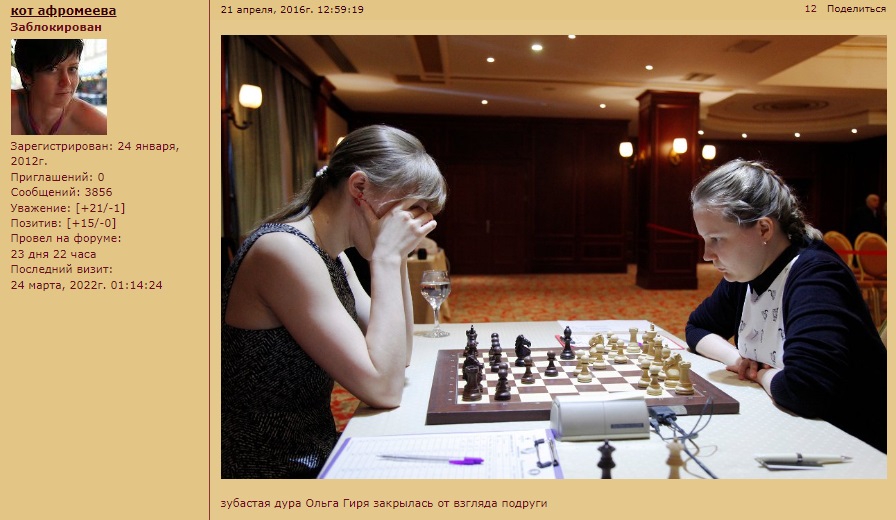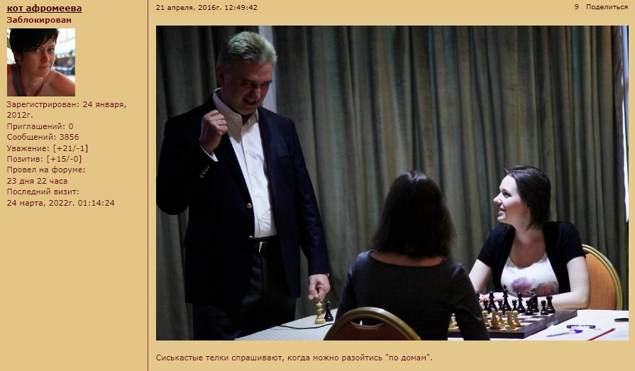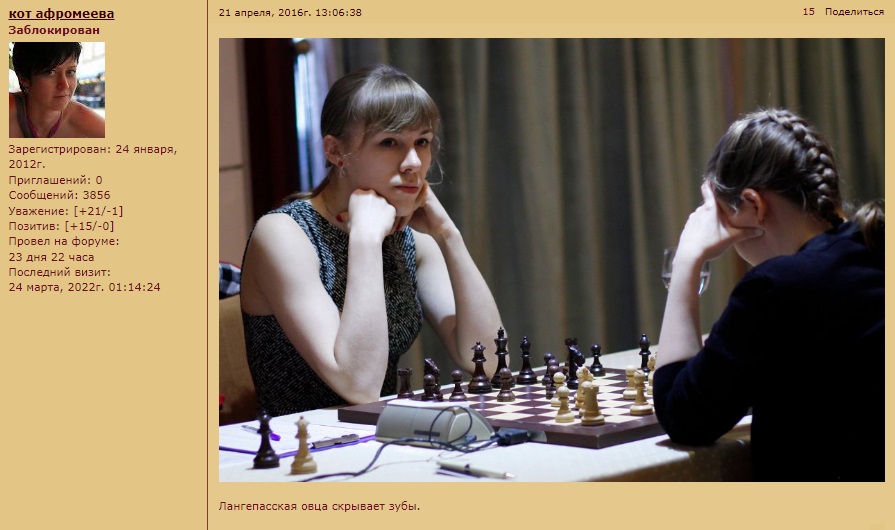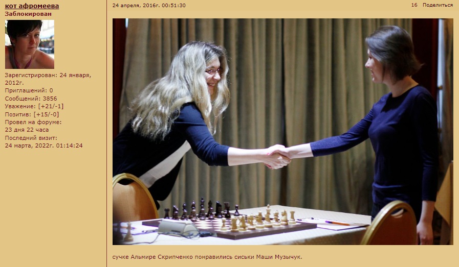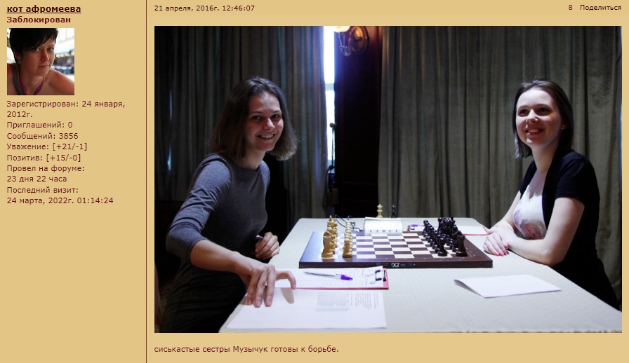 Сейчас надо обсуждать и обсирать околошахматные аспекеты (рейтинги, зачетные гонки, организация, читерство, санкции, читерков-индусов и почему Аронян после 40 заиграл как комп), но точно не шахматные фигуры