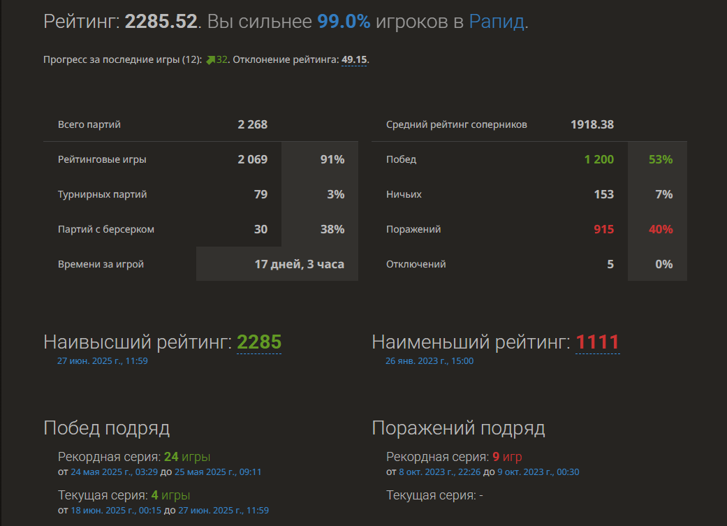 хоть и видно что начиная с 23-о года рейтинг я слабо прибавил как минимум для себя, хотя бы потому что бывали периоды когда отдыхал от шахмат и паре и по 5 месяцев но тем не менее на данный момент жизни я просто последний шахматный хикка и шахматы имеют для меня главный смысл жизни так что буду рад каждому человеку персонально у кого рейтинг ниже 2200 помочь и на стадии дебютного репертуара ну и в целом где-то подсказать как стоит трактовать те или иные позиции и всё такое.. вообще буду рад если кто-то будет скидывать свои партии а я буду их разбирать ну и гдето может быть смогу быть полезным.. вооот
