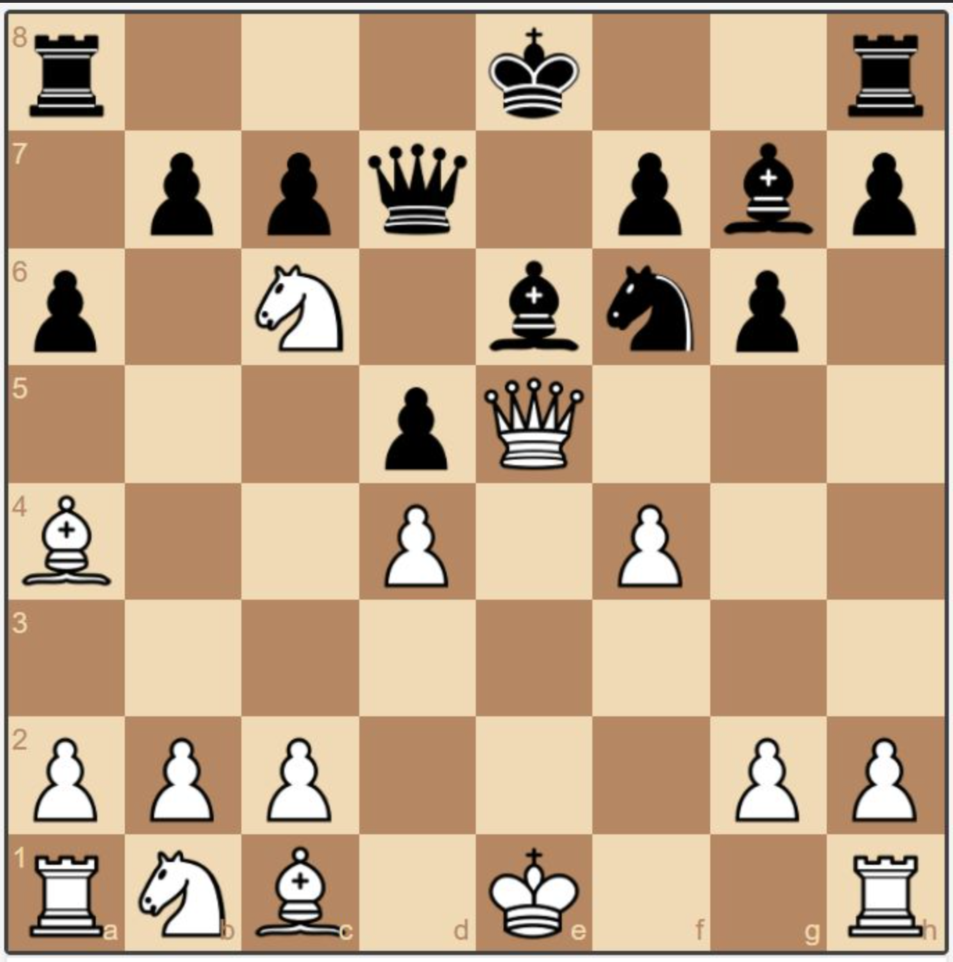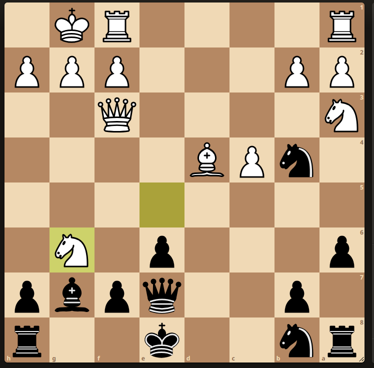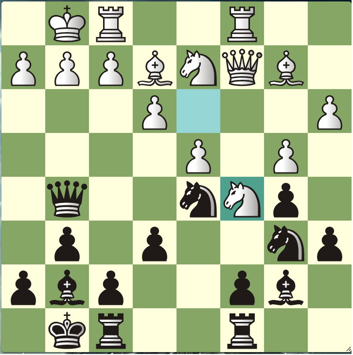 Корректирую ваш вариант с прыжками коня: после белая ладья д1 1. Черный слон д6, белый конь ц3 2. Тут нужно ткнуть ферзя черной пешкой б5 (проверка куда уйдет), белый ферзь б3 3. Тут уже можно черной пешкой аш6 ткнуть слона, потом черным планировать уход ферзь ц7. Белые могут дать шах с е6 но это ничего не дает. Пешка е5 защищается ферзем с ц7