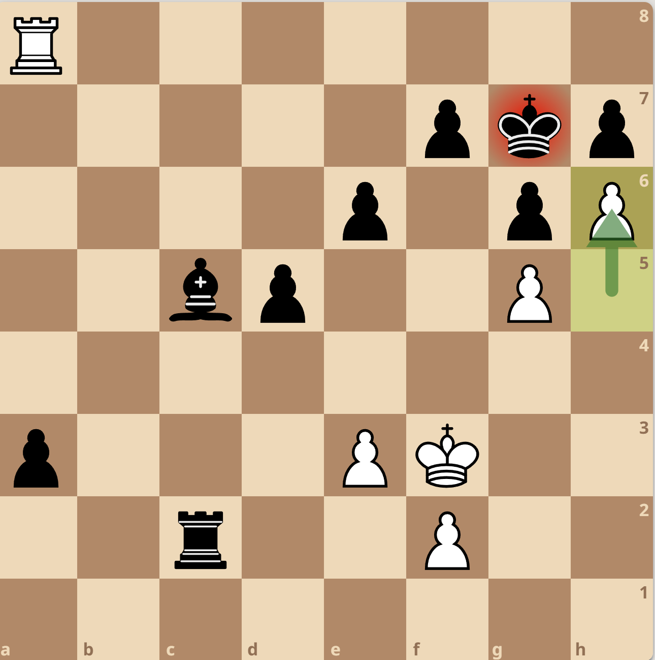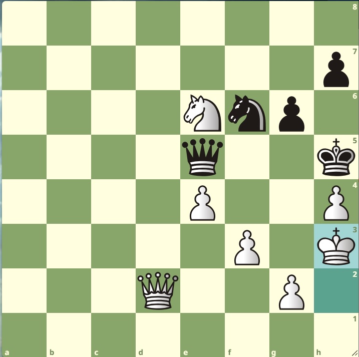 >>3225967 Ну, она купит время, но что дальше ? Пешка на g4 всё ещё происходит. Затем h4 на g5 и чего ? Лучший варик будет если король на g6, но это всё ещё смерть.