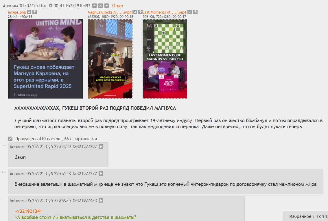 >>3240447 Я тоже следил плотно, трансляции посматривал на перемотках ради камер с лайф досок. На личесе проматывал смотрел наших ру. Потом наши все посливались к 6-7 туру, у меня мотивация пропала этой херней заниматься чето следить и болеть. Ни одного русского в тп 2026 не будет. 10 лет назад там наоборот одни русские были. Пусть бля фшр и минспорт и все остальные говна пожрут....НО НЕЕЕТУШКИ! Будет столько разговоров про то ааах каааак же близко было, анлаки, чуть чуть не хватило! Про судьбу одной партии(одного хода) и прочие оправдания >>3240999 Да индусы драму разыгрывают. Сам подумай из всех топ индусов он играет хуже всех потому что ему не нужна никакая путевка в тп. Делают вид что он простой парень на селе. У меня перед этим турниром была мысля что он будет сливать своим же индусам, как они делали в тп 2024 что бы этого копченого читерка вывести в лидеры, но всё хитрее обставили