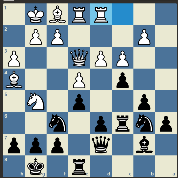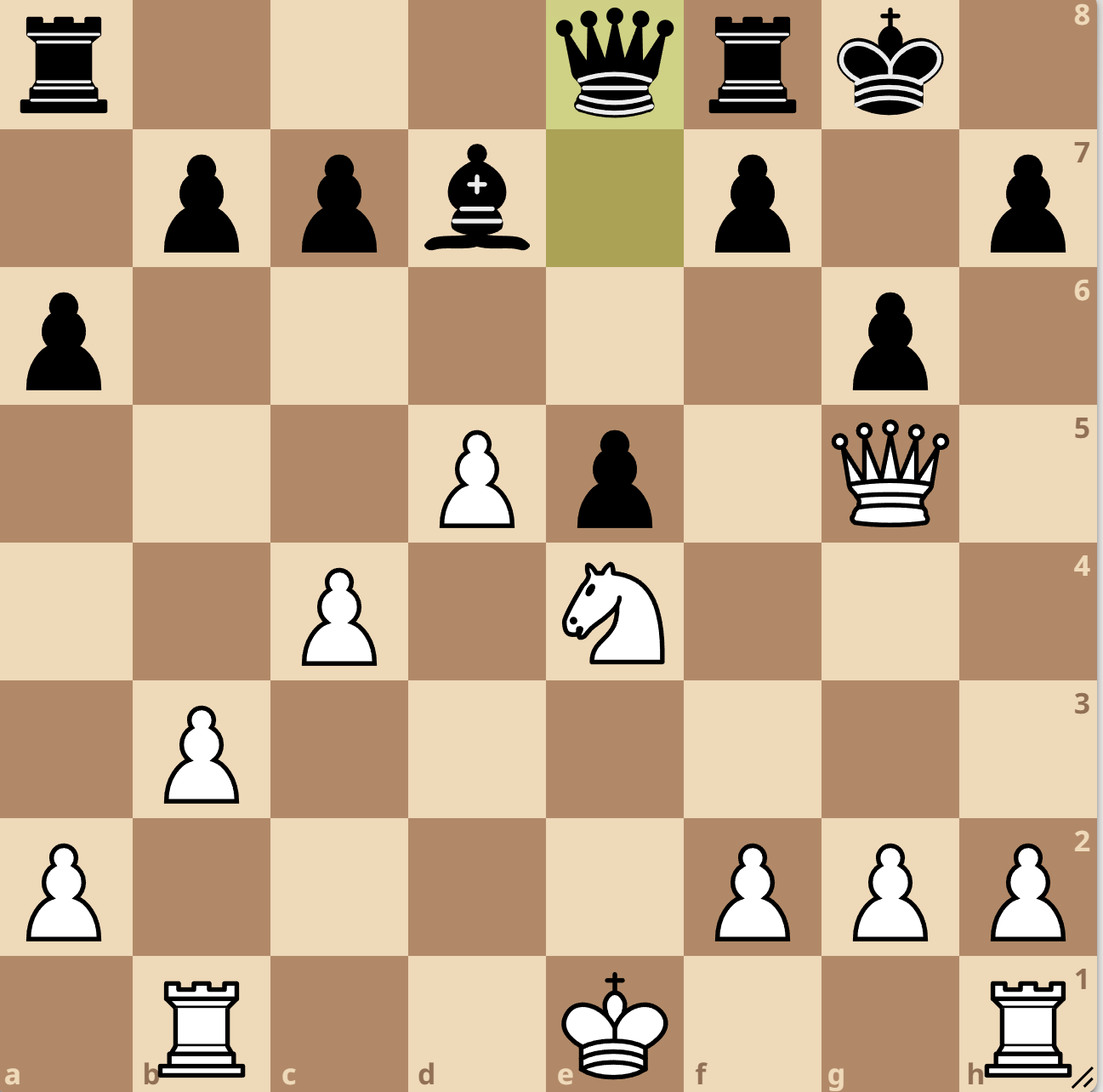 >>3241833 Лd1 выигрывает, верно. Брать ее плохо ввиду 1.Фe6+ Ce7 2.Фe7x Ферзю приходится уползать на с7/с8, чтобы прикрыть от мата ладьей поле d8, а дальше самое четкое простое Kf3. Конкретики пока нету, но с таким королем и развитием черные долго не протянут. Ну, будем считать что решил, раз Лd1 нашел.