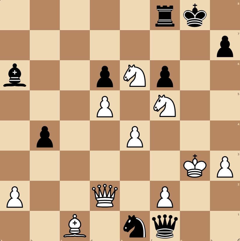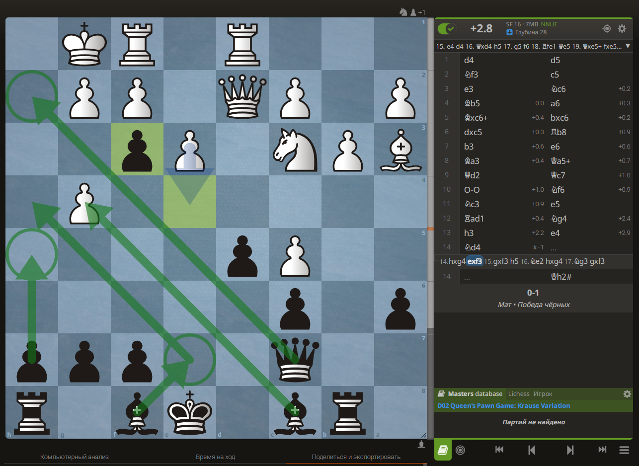 >>3228563 Ну может ты и прав, да. Если свалит на f1, то можно опять его шахом от слона на чёрное поле прогнать, а дальше действовать, как я написал (не просчитывал все варианты, каюсь) Upd: я понял, после того, как черные жрут ладью, белые ещё могут слоном от шаха закрыться, но можно слона ёбнуть ладьей, белые сожрут ладью, но у чёрных один хер проходная на А, и король ее не успевает сожрать по правилу квадрата. Ладно, черт с ним, там игроки с рейтом ~2к, куда мне до них. Копаем тактику дальше.