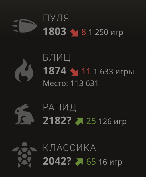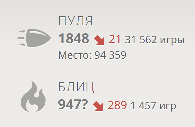Посоны, что там с личесом? У меня уровень 1200 в рапид, 1400 блиц и около 2000 в пульку Недавно психанул, удалил акк. потом снова зарегал, и чет начал выигрывать 1900 в блиц. сейчас 1800 рейтинг в 3+0. думал - случайно. но нет. играю и выигрываю. партий 30 уже подебил. С хуя ли мой рейт так бустанулся? когда я скину его до нормальных 1300+?