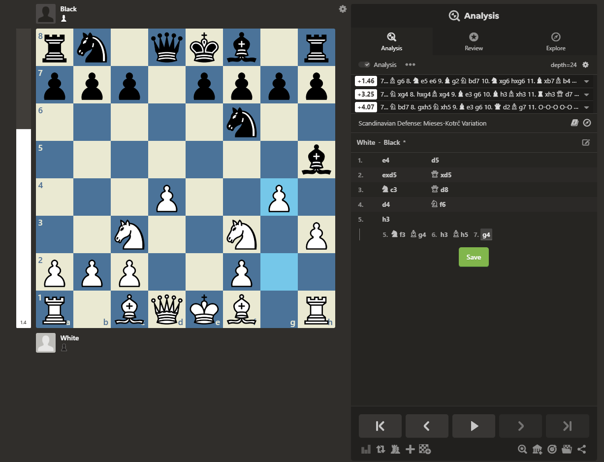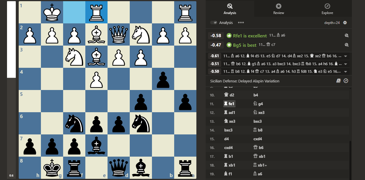 хотелось бы разобрать 2 неточности это 13. Сd2 вместо g4. g4 у меня был ход в голове с идеей предотвратить ход f5 но мне не хотелось ослаблять королевский фланг т.к в длинную сторону рокироваться я не хотел ибо там уже линия с вскрыта ну и интуитивно как будто не безопасно гдето. вторая неточность это 24.Лxg7+ вместо просто Кf8+ это такое может случиться когда много думаешь о атаке одного поля и совершенно не замечаешь простую вилку