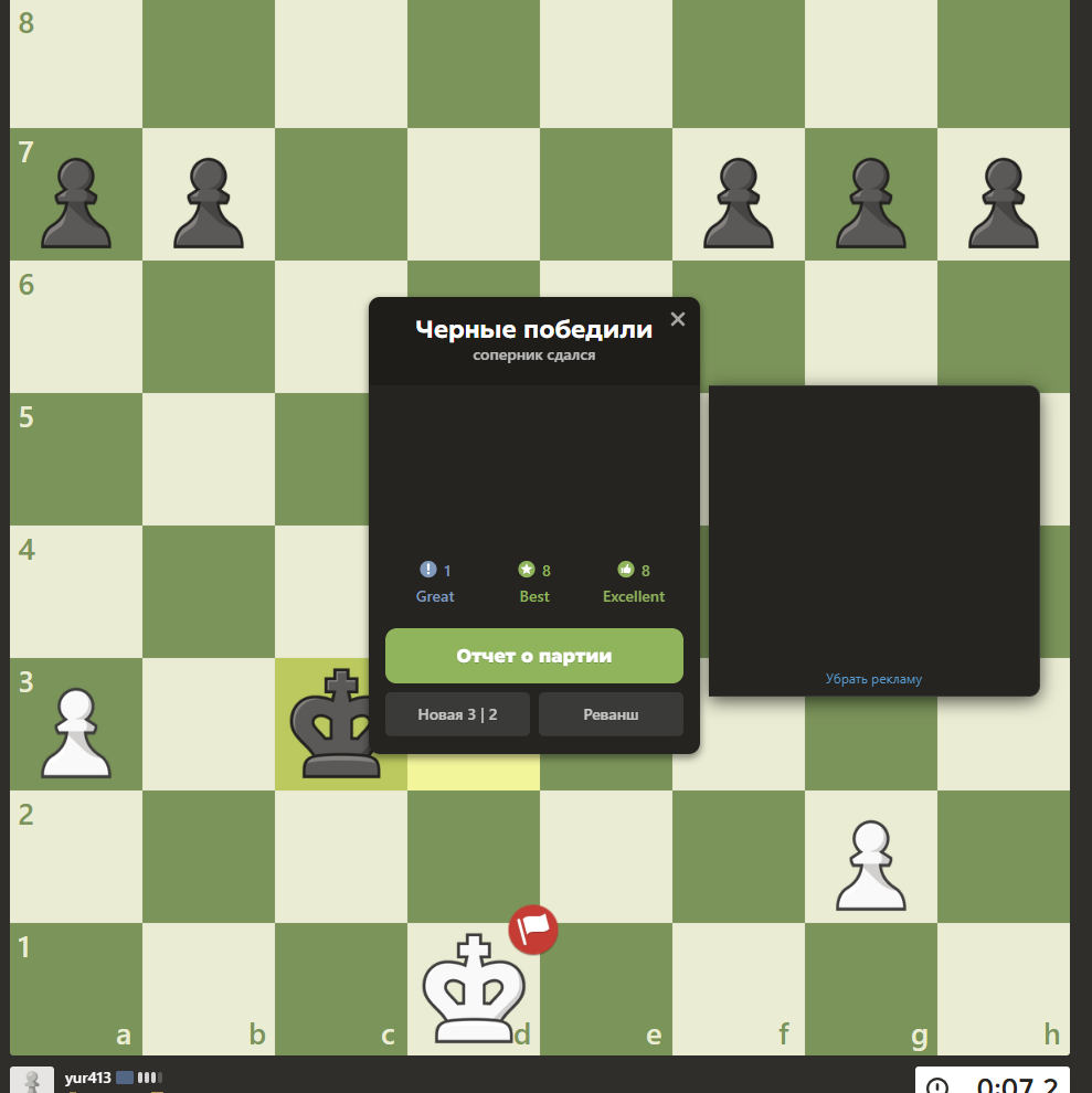 >>3242646 Аааааа прикольно прикольно! Только проблема в том что после конь аш6 король белых уходит на аш8 и наши шахи закончились. Нажимаем сдаться. Чтож главное не упавать духом, даже Магнус проигрывает, но становится лишь более мотивированым и заряженным на победу