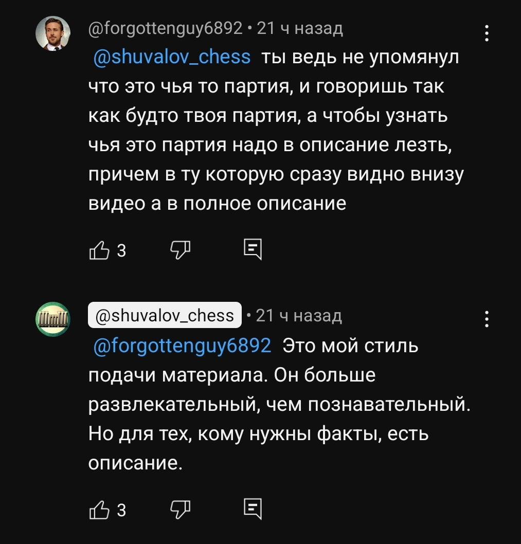Особенно ору с того что на каждом турике у коментаторов движок показывает счёт и они с ним типа "Анализируют", де факто просто озвучивая работу движка на протяжении нескольких партий. "О, движок показал +2, это был зевок!"