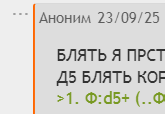 >>3223617 Моя проблема в том что я играю очень старательно, вдохновенно. Желание есть играть нестандартно и думать над каждым ходом. Проблемы три: - я просто в какой то момент зеваю фигуру и на следующем ходу противник срубает ее. Либо противник рубит, потом рублю и рубит. И все. Тупо нечетное количество разменов 1 или 3 - у меня нереально горит жопа. Я могу заорать громко, так что соседи стукнут ногой сверху. Постоянно бью предметы, в том числе и по голове от злости. Могу встать со злости уебать ногой об гладильную доску и рассечь до крови стопу. Стул с ножками в стену швырнуть. Мышку разбить. По голове ебнуть тарелкой чистой. Я ее всегда мою что бы не засыхала и она рядом чистая стоит. - у меня один глаз с болезнью он плохо видит. Нет денег оперировать. И мне строго запрещено воздействия. Играю по сути с одним глазом и это сами понимаете. Пиздец. Это просто минус 30% к общей силе и конечно же х30 увеличивает шанс потери фигуры который я указал в первом пункте.