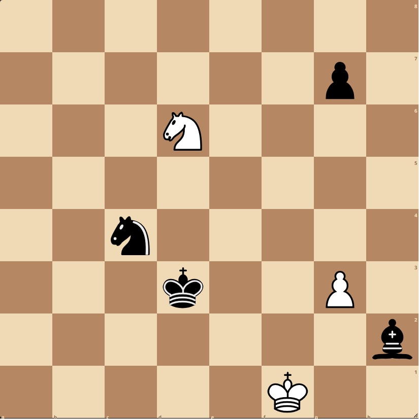 >>3242751 И продумав ровно 2.5 часа я родил нечто гениальное Слон е5, пешка ф6, Слон обратно д6!! С очень похожей идеей, нету шахов от черных и связки - наверное выиграно.