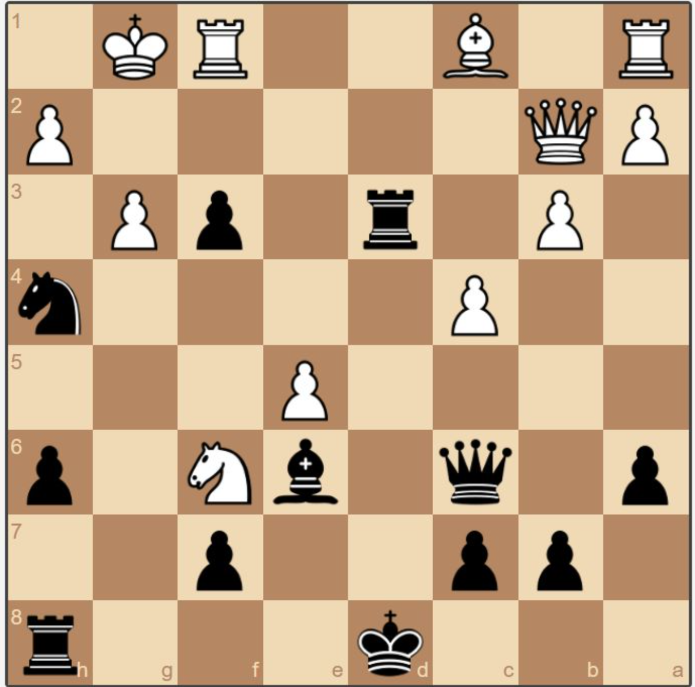Вы реально никто из вас не видит что в этой задачке на втором ходу маячит смертельная угроза ладья белых с д1 на д8 с потерей ферзя?? У вас еще ниже 1300 рейтинга и тоже плоховидящие?