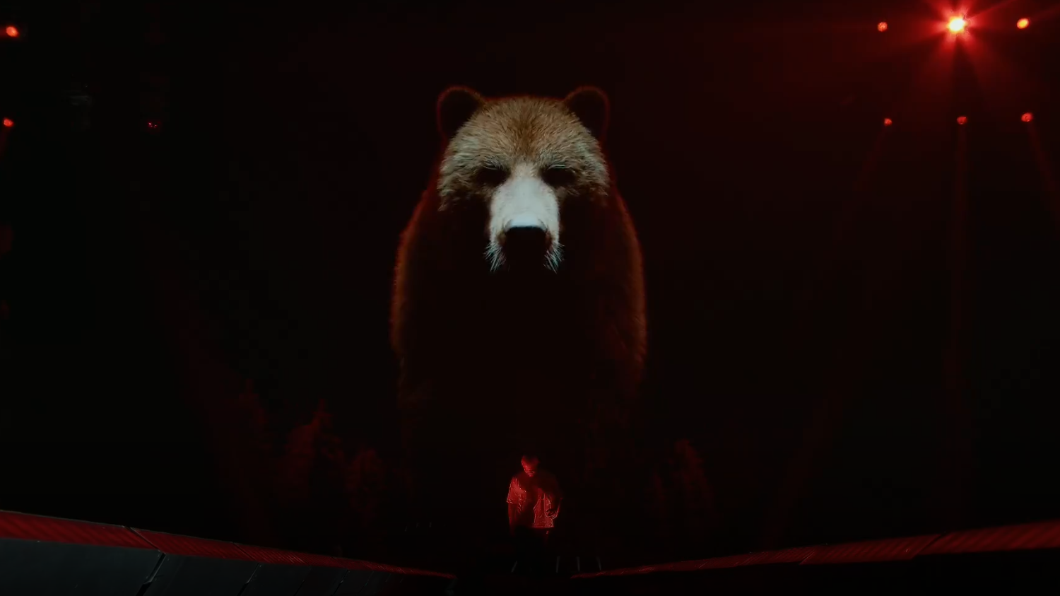 Скорее всего, такое тематическое оформление выбрали в знак уважения к Териблу, так как он как раз угарает от всего этого русского колорита - медведи, волки, балалайки, матрешки. В одном из интервью он рассказал, что обнимался с дрессированным бурым медведем для клипа, который стал очень популярным на Западе. Короче, это временное решение, рассчитанное на конкретный эвент. Собаку вернут к следующему эвенту либо заменят на другое животное