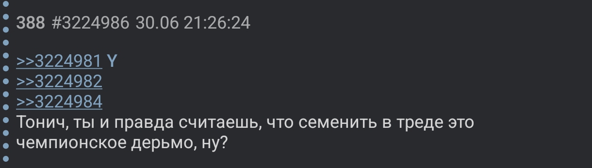 >>3224709 >чурки, чурки, чурки Тебя в детстве изнасиловали чурки? У тебя какая-то нездоровая кавказофобия >Один из этих пенсионеров чемпион ЮФС здесь и сейчас Пояс взятый в бою с середняком, опять же Волк уже не торт, и не борцуха >Второй пенсионер выебал в хвост и гриву претендента на титул в весе выше Вот именно, что выше. Хотя Холовей это неплхой скальп, но опять же уже пенс и не борец >Третий вычистил весь вес кроме сисляма и булщита с арой Последняя нормальная победа (над Порье) была давненько Вроде очевидные вещи для любого здравого человека