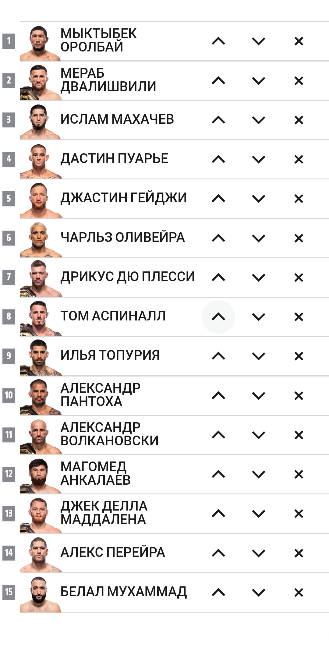 П4п это вообще про доминирование в дивизионе, кто больше доминирует, тот и выше в рейтинге среди других. Грызурии конечно аванс большой выписан. А так всё верно, Макс с шуточным поясом в самом конце, Мага и Том ещё ни одной защиты не оформили и только взяли свои пояса. Волк только вернул пояс, и неизвестно сможет ли защитить, но за былые заслуги его немного повыше. У ДДМ серия + уверенное взятие пояса. Остальные уже гоаты. Гигус, Мераб и Пантожа успешно защищают свои пояса. С чего вдруг они должны быть ниже Калмача, который трусливо сбежал от опасного грызуна? Грызун хотя бы с поясом сейчас, а калмач ещё не ясно, победит ли ДДМ. У грызуна оч много работы, у нему там уже очередь выстроилась. Если когда Сорье победит Макса и заберёт БМФ, он с 300% вероятностью захочет в последний (самый-самый последний) раз потанцевать с грызуном, и тот конечно не откажет. А Калмача, даже если возьмёт пояс, ждут нихуёвые приключения среди молодых и сильных в полусреднем.