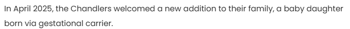 >>3225796 Не, они получается взяли новорожденную у суррогатной матери, вдобавок к двум имеющимся приемным. Жена у Чендлера короче какая-то ведьма, которая его к себе вообще не подпускает. И ведь он за ней несколько лет бегал, пока она отрывалась по полной. Он походу от того и тренит, как не в себя, потому что жена сука.
