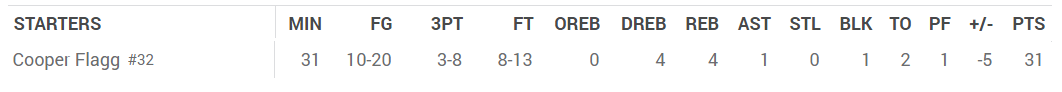 >>3227567 Хз, так се стата. 20 владений из 60 всей команды. 30 очков из 69 всей команды. Играл 31 минуту. -5 по итогу, 0 стилов, 2 потери на 1 ассист. Тот же Харпер в Спёрс - 20 минут, 12 владений, 16 очков, команда победила. Даллас вышел тупо статку набить для Флэгга.